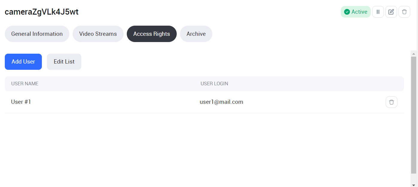 On this tab, the user can view the list of sub users who they granted access to this camera.