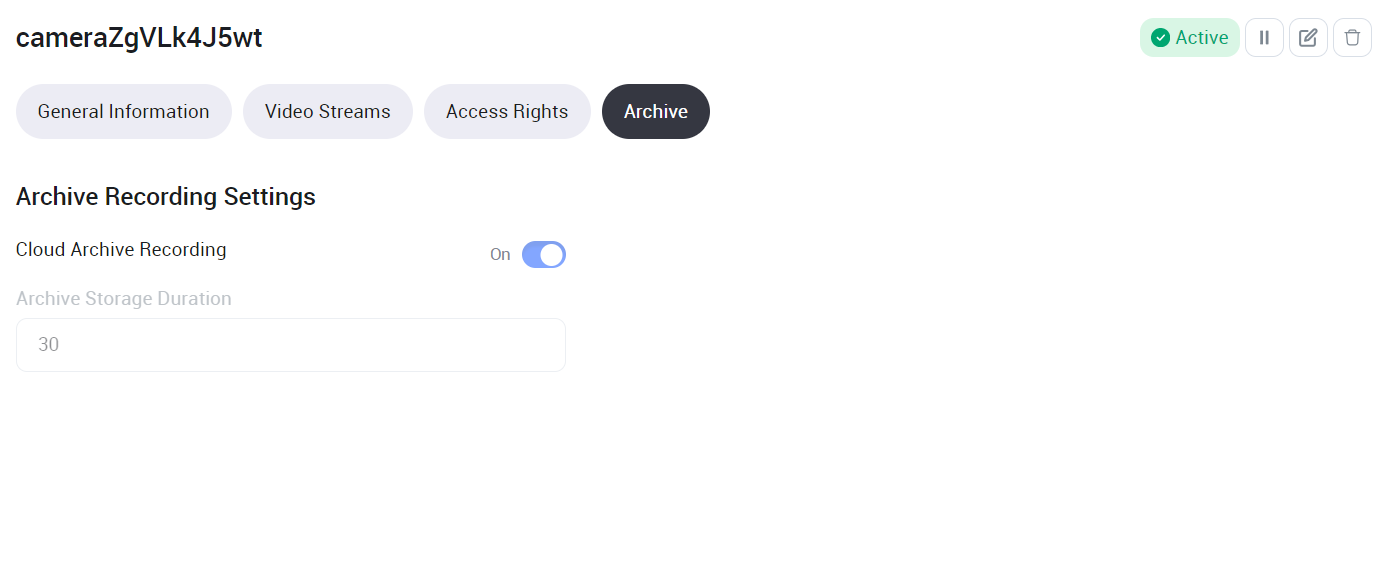 To configure the Cloud Archive recording settings, enable it by dragging the On toggle. Specify the number of days to store the archive – minimum is 1 (one) day.