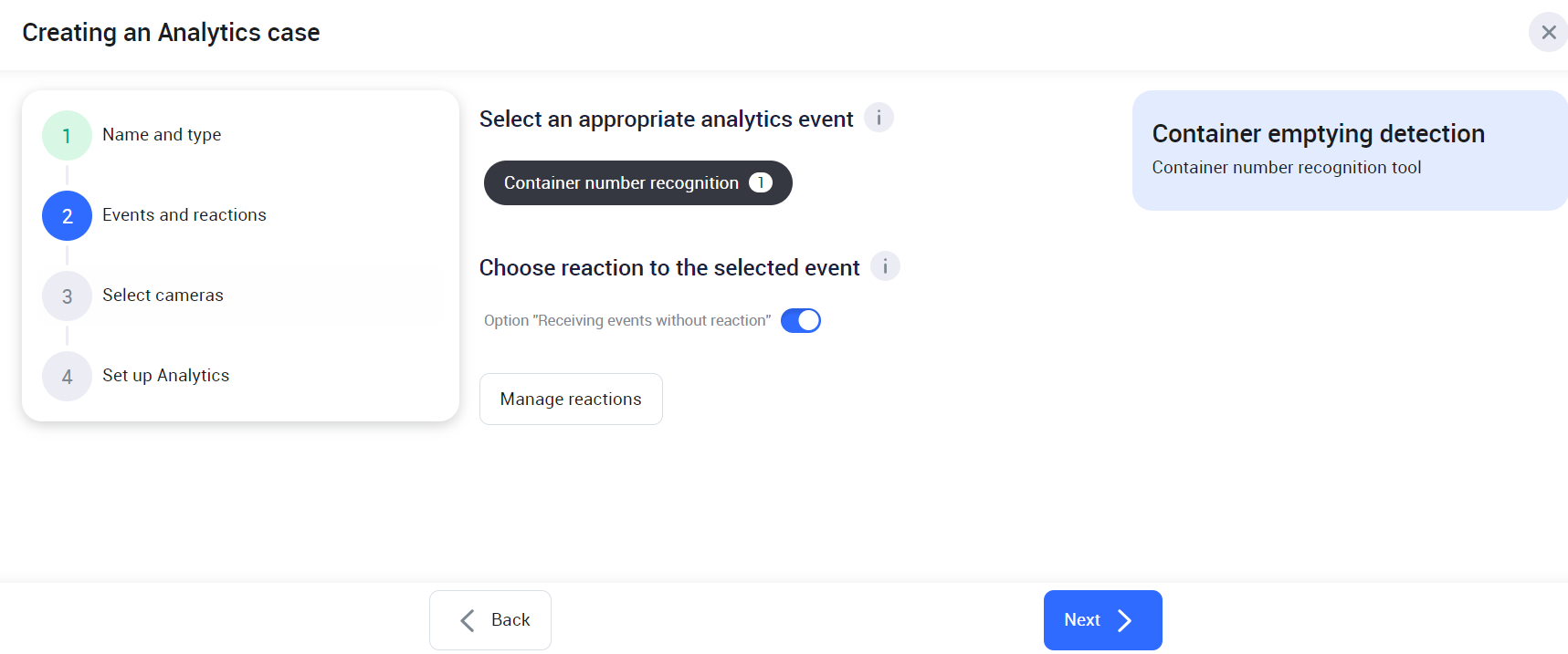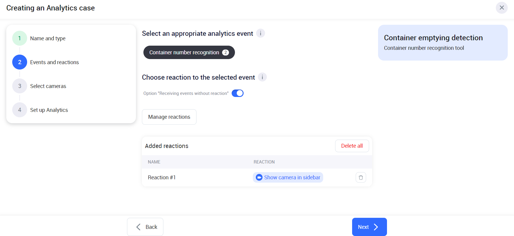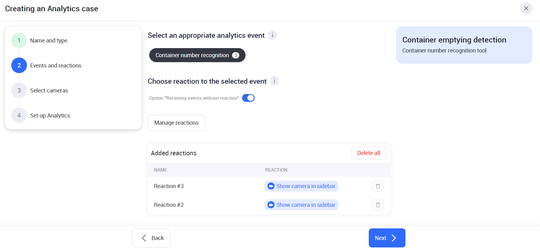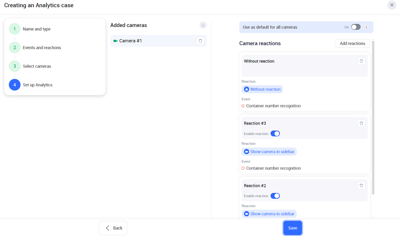 Under Camera reactions, all the added reaction on step 2 to the current analytics case will be enabled by default. Edit the settings if required: