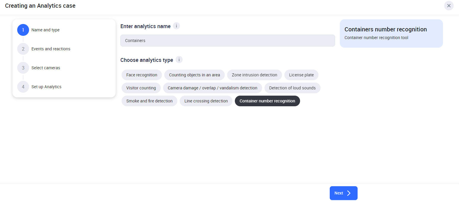The Container number recognition analytics type is designed to detect and recognize vertical and horizontal number plates of cargo containers.