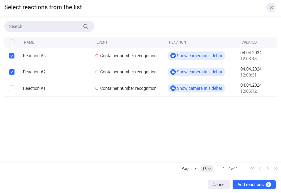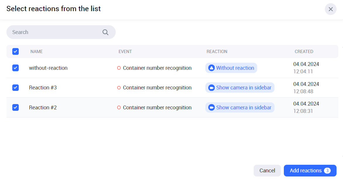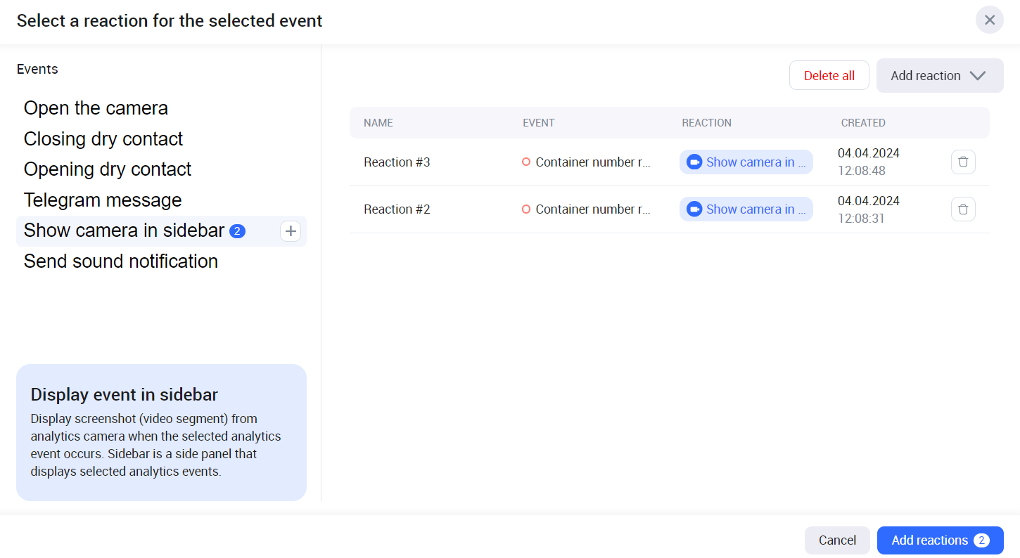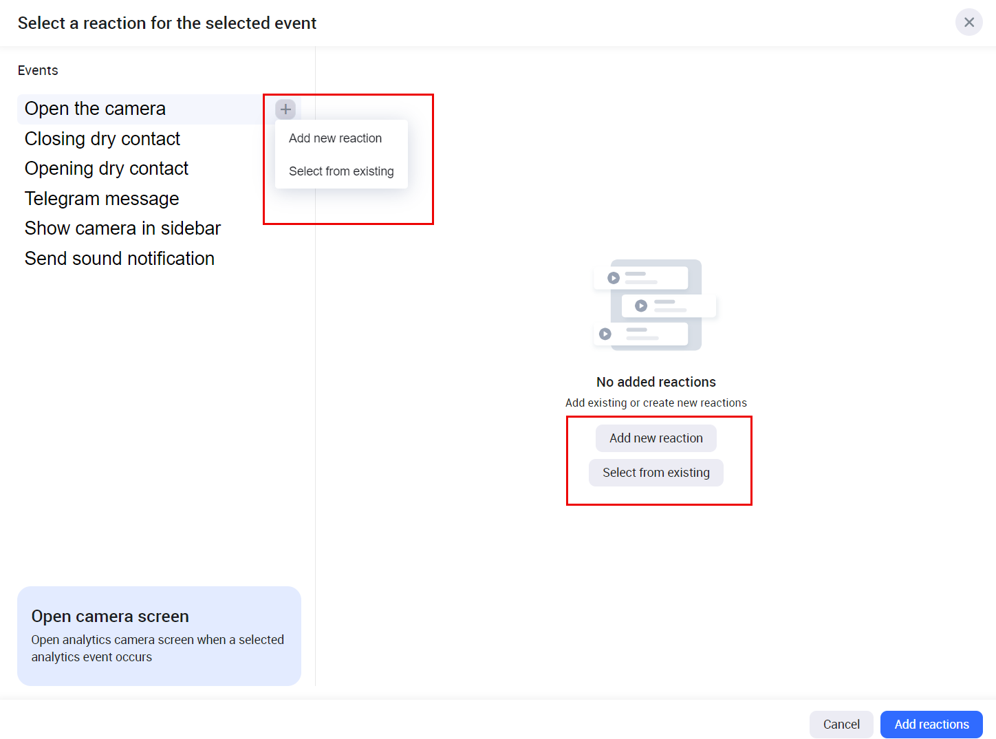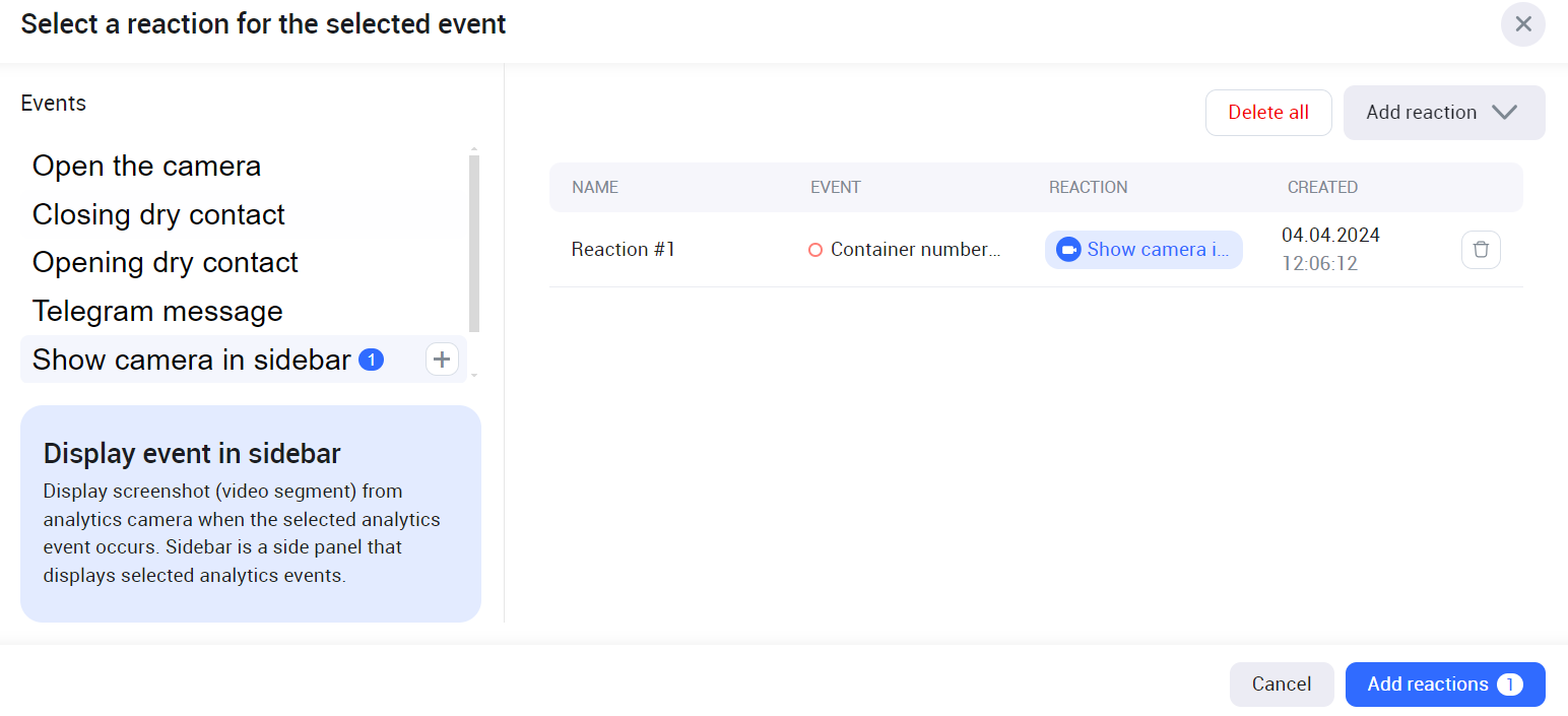 As a result, the added reaction is displayed in the list of reactions of the selected reaction type. To further use this reaction, when setting up cameras, select Add reactions.