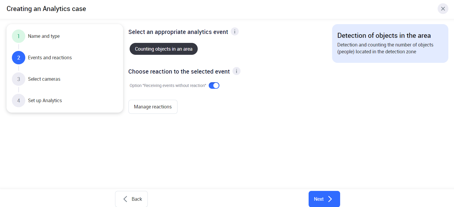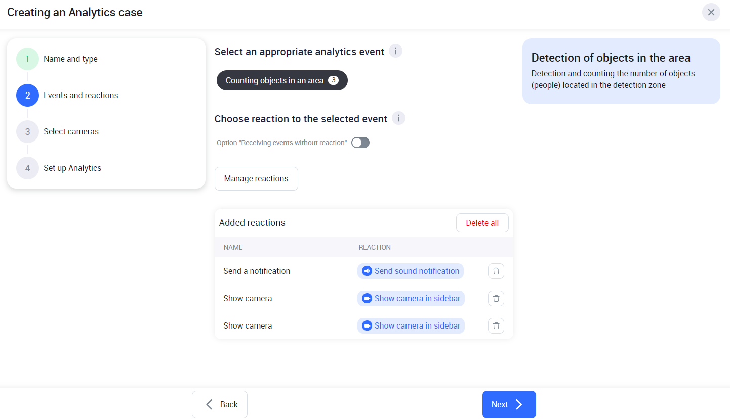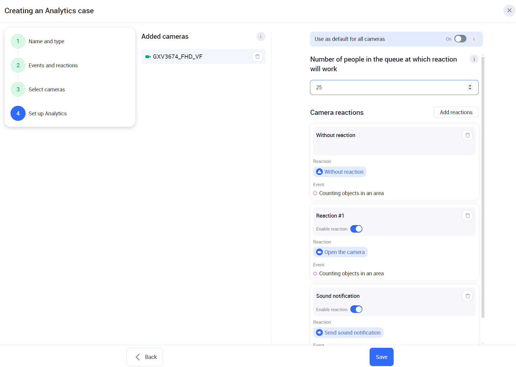 Under Camera reactions, all the added reaction on step 2 to the current analytics case will be enabled by default. Edit the settings if required: