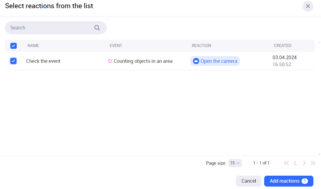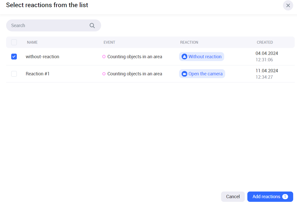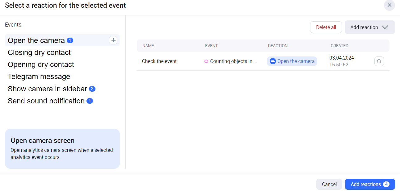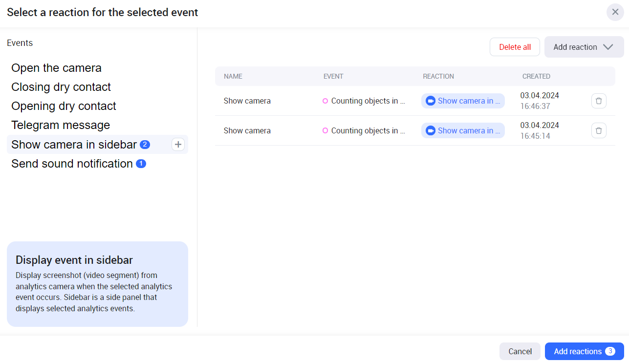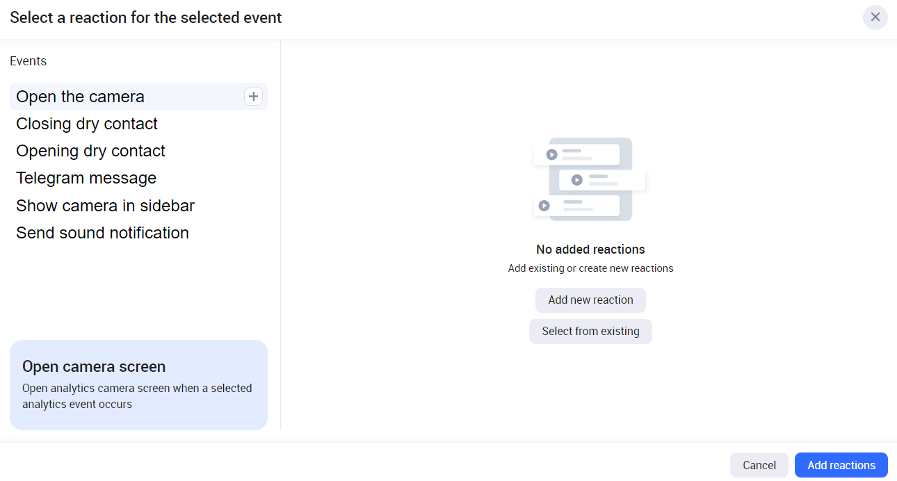 As a result, the added reaction is displayed in the list of reactions of the selected reaction type. To further use this reaction, when setting up cameras, select Add reactions.
