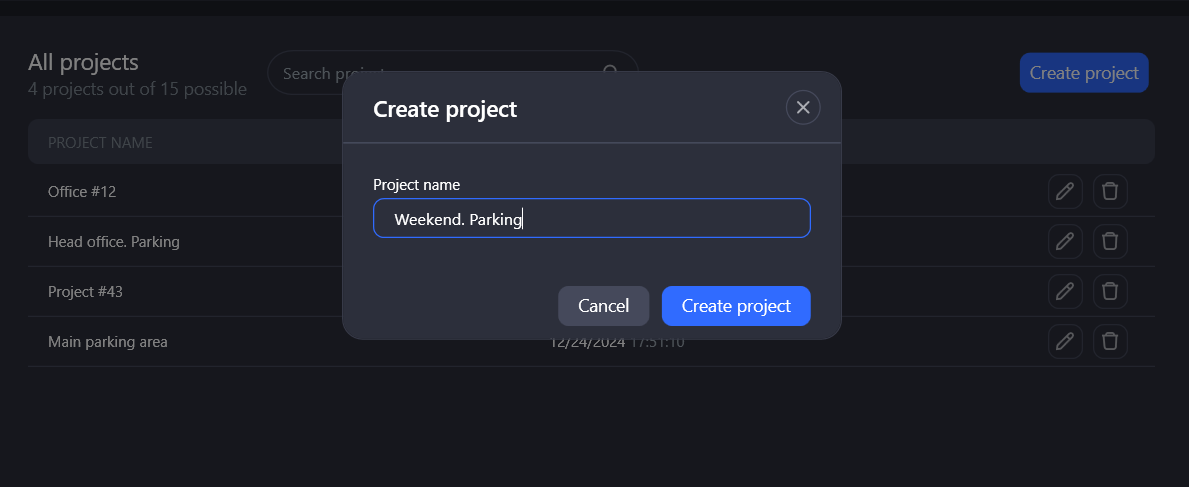 In the opened Create project window, enter a name for a new project. Allowed characters: Cyrillic, Latin, numbers, hyphen, special characters !@#$%^&*()[]{}<>_- and their combinations. Maximum name length - 50 characters. The project name should be unique.