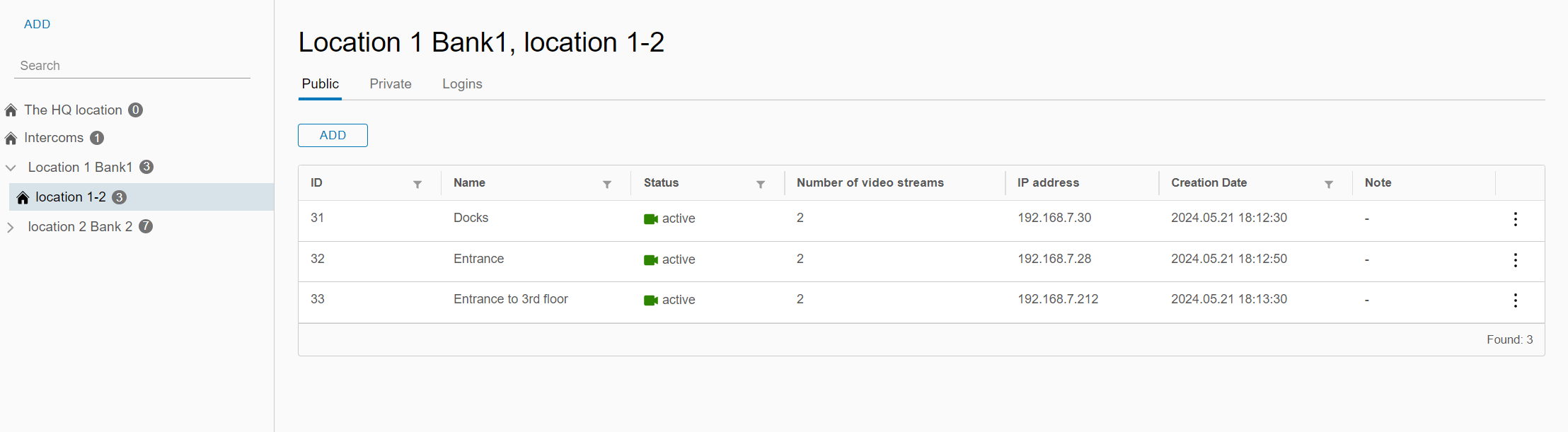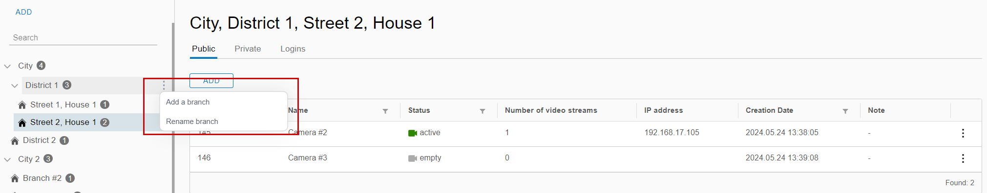 To view cameras in a specific location, find the address in the tree and select the number. As a result, all cameras of the selected location will be displayed in the table.