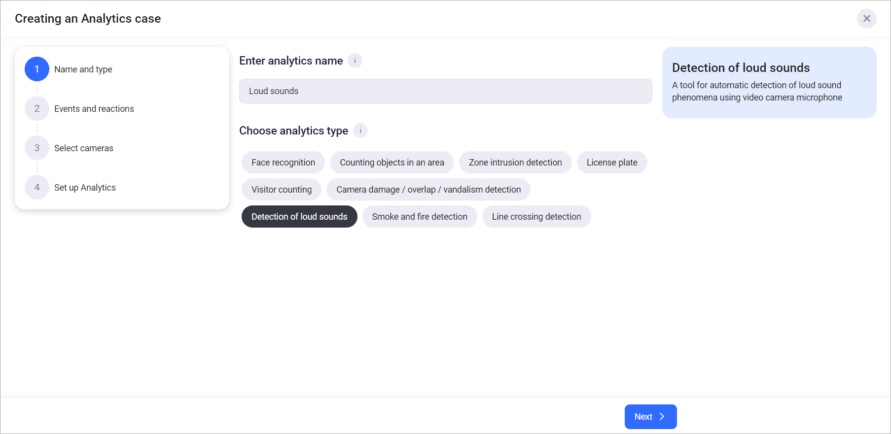 The Detection of loud sounds analytics type is designed to detect loud sounds that can be captured by the camera's microphone.