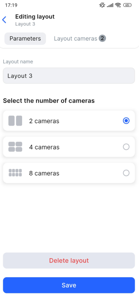 On the Cameras tab > Layouts. Call out the context menu of a relevant layout by selecting the vertical ellipses icon (⋮). You can edit the following parameters: