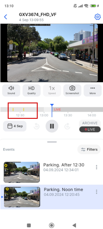 Event markers are presented on the archive part of the timeline if the camera has the archive enables. These markers are visible only to users with the permission to view markers. The Marks >View marks permission is granted to the user by the administrator.