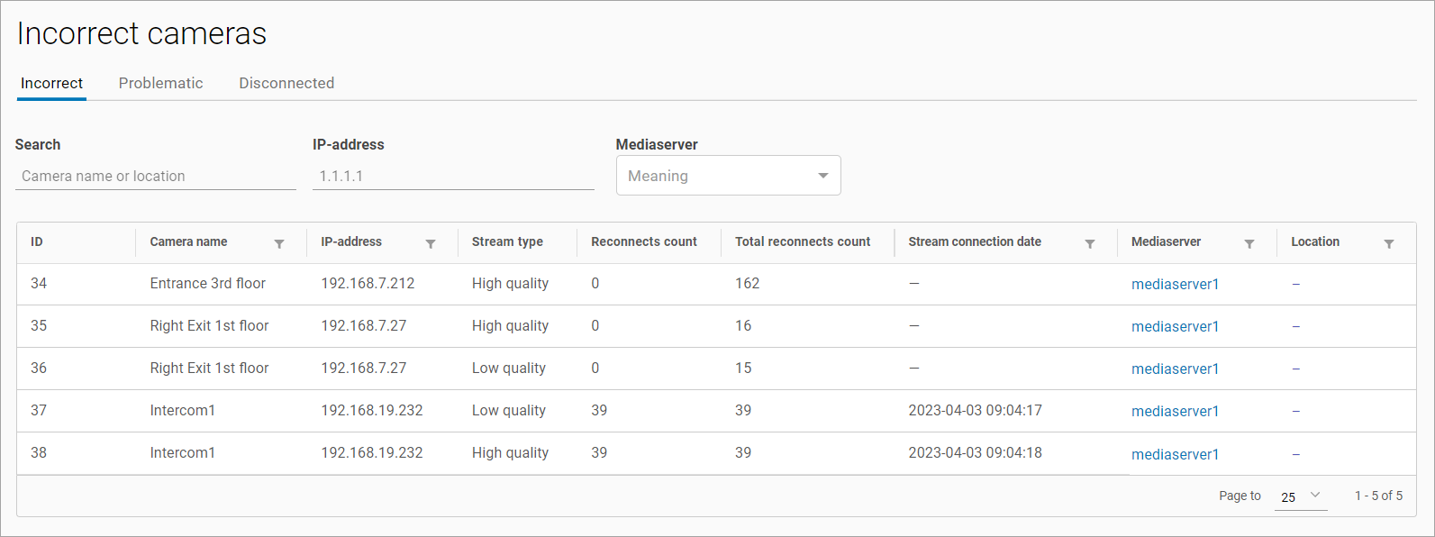 If the Incorrect cameras setting is disabled or unavailable in the mediaserver card from within the General data tab, cameras which streams are allocated to that mediaserver won’t be displayed in the Incorrect cameras section. For details, see the View and edit Mediaserver documentation section.
