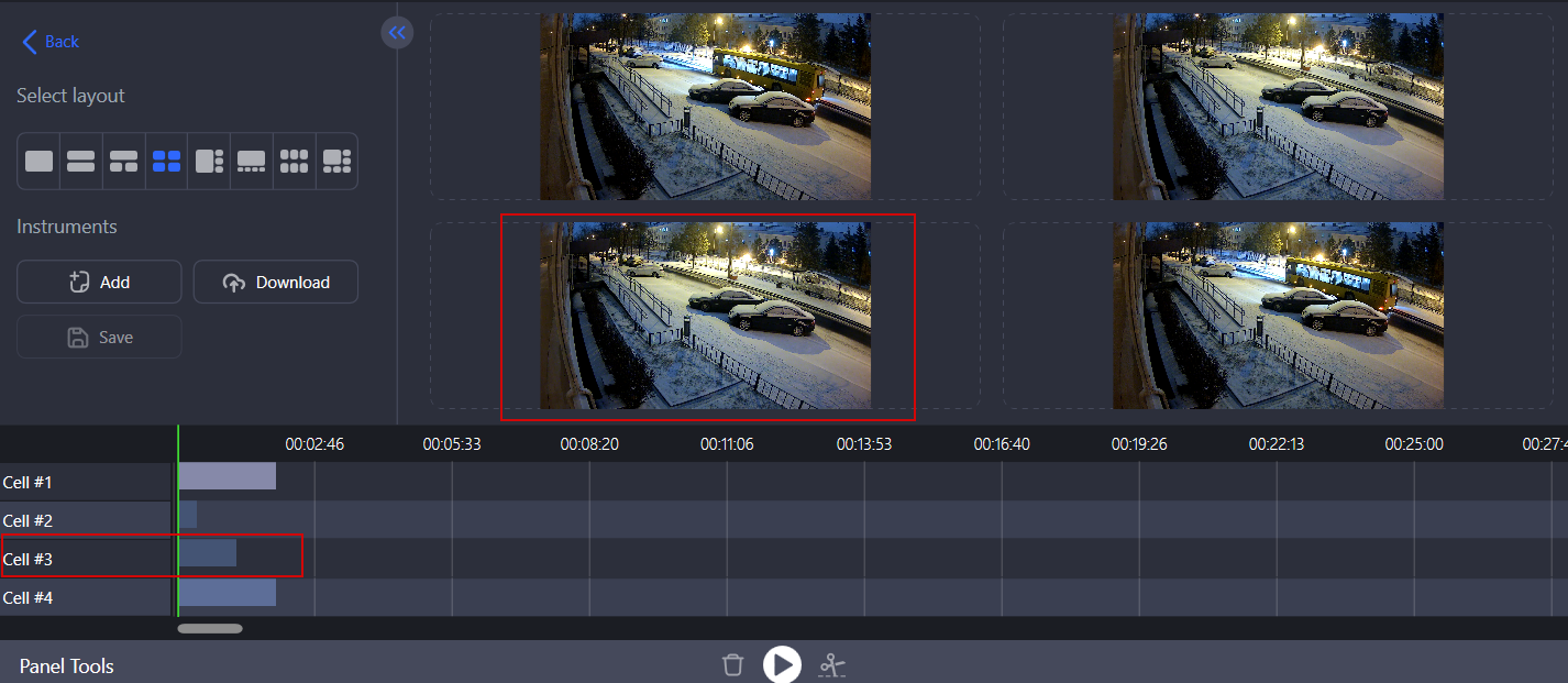 Layouts consist of cells. Each cell in the layout corresponds to a separate timeline at the bottom of the section. The timeline is labeled with the name and number of the corresponding cell, as shown in the image below. Video files for viewing and editing are placed on the cell timeline.