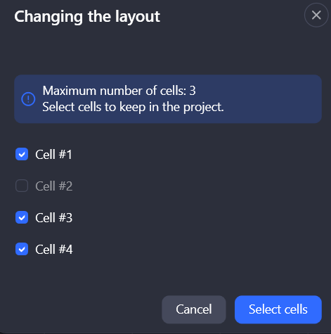 Decreasing the number of cells triggers a dialog box, in which you select the cells from the current layout to retain in the new, smaller layout. Files in the selected cells will be preserved in the new layout. Once the selection is confirmed, all other cells and their files will be removed from the project.