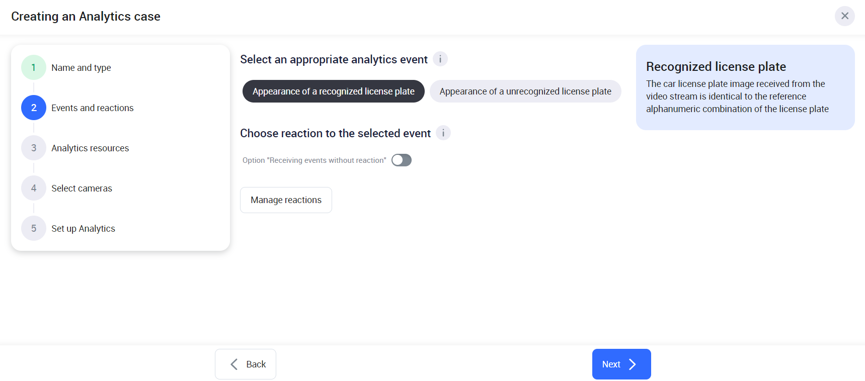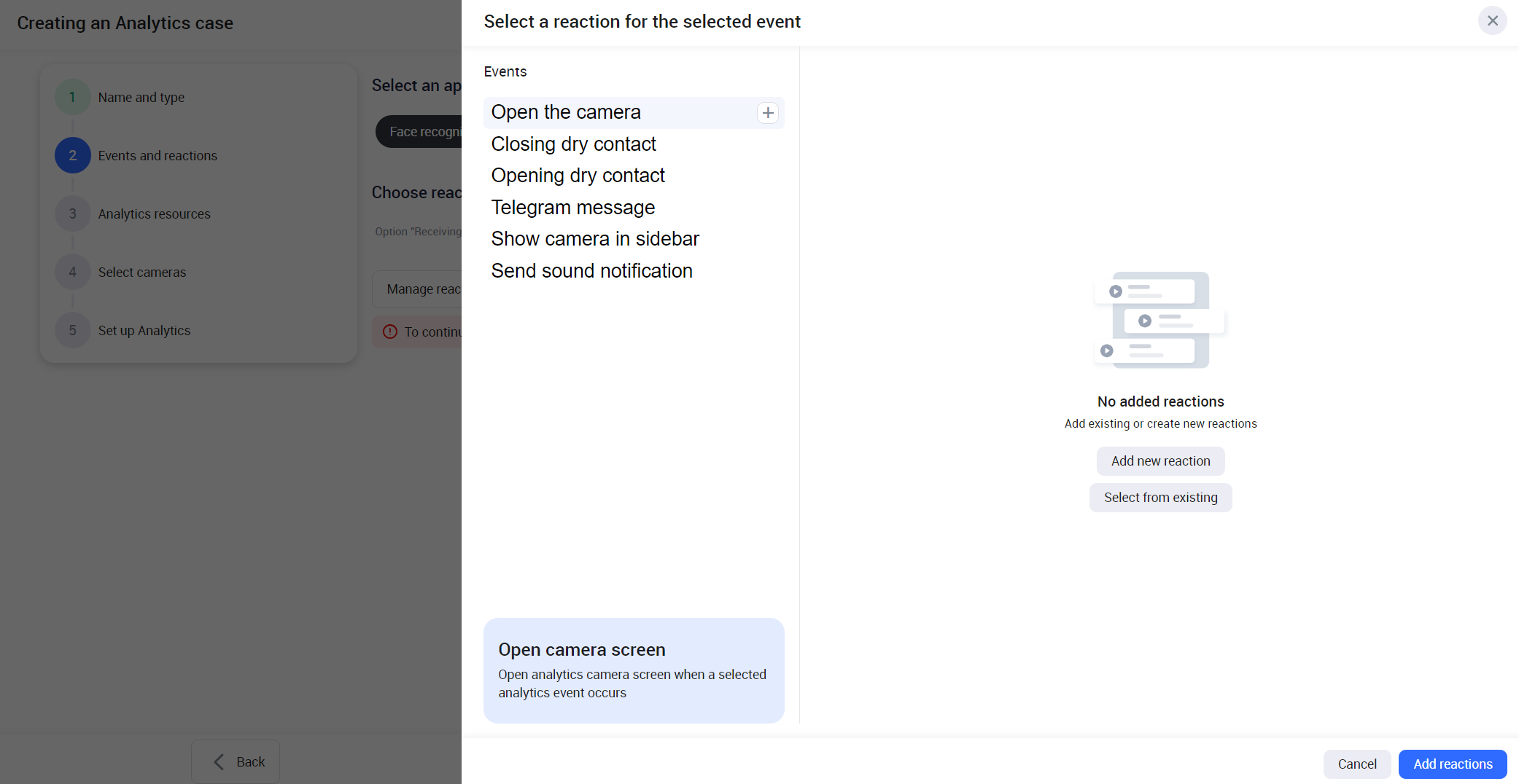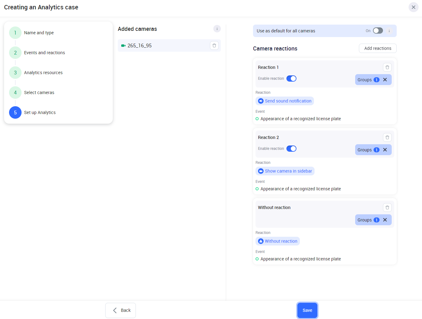Under Camera reactions, all the added reaction on step 2 to the current analytics case will be enabled by default. Edit the settings if required: