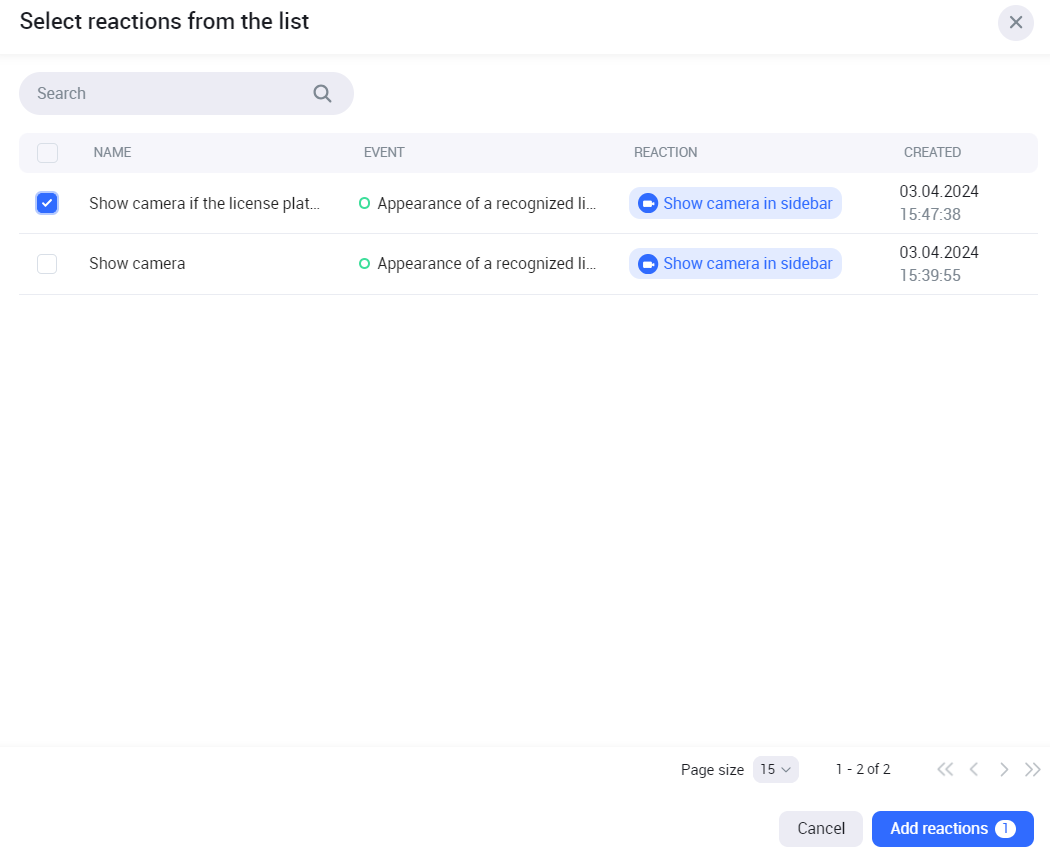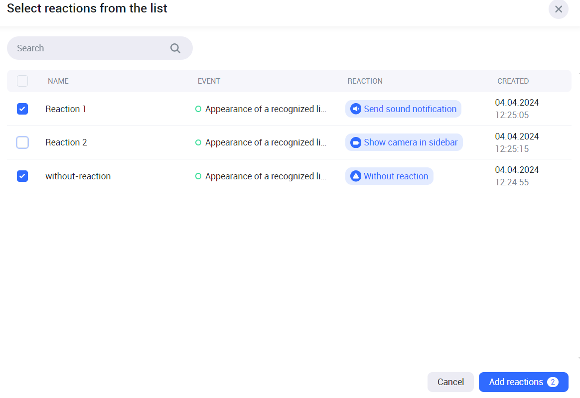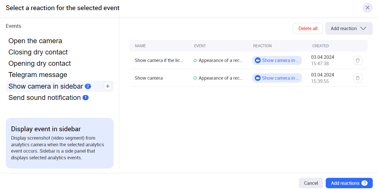 As a result, the added reaction is displayed in the list of reactions of the selected reaction type. To further use this reaction, when setting up cameras, select Add reactions.