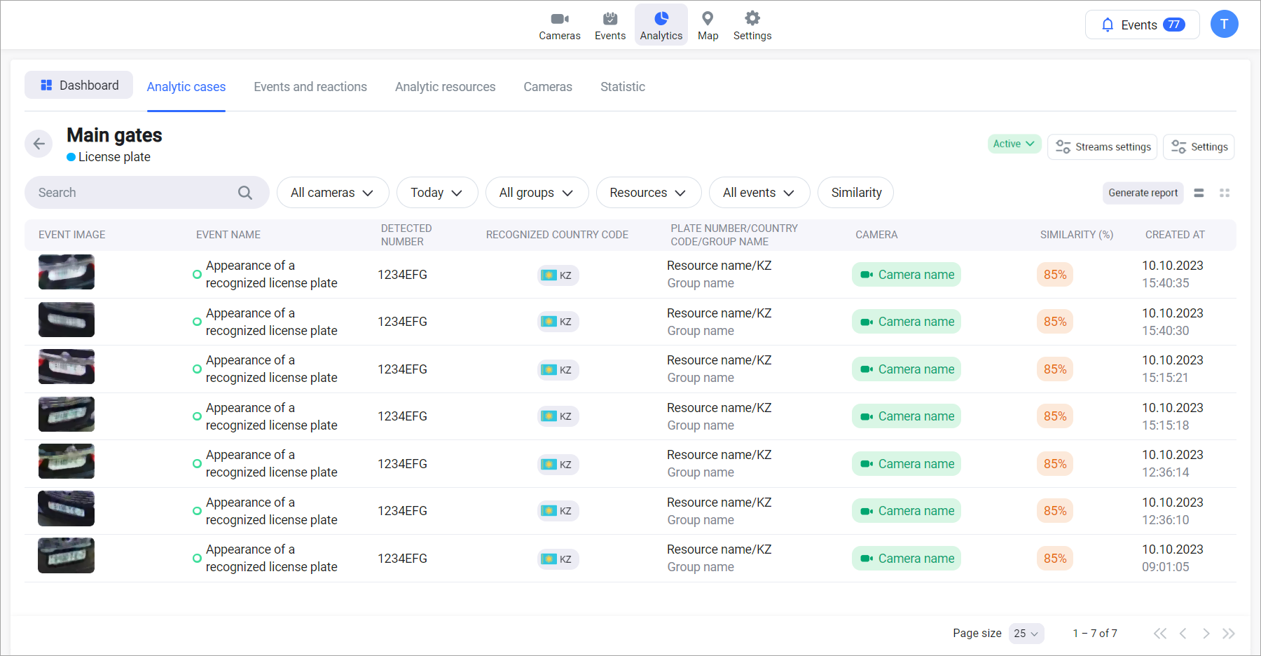 To view an analytics case of the License plate analytics type, you can choose between table and tile display modes. The tile display mode is set as the default. Both tile and table display modes allow you to set the number of items displayed per page (15, 25, 50, and 100).
