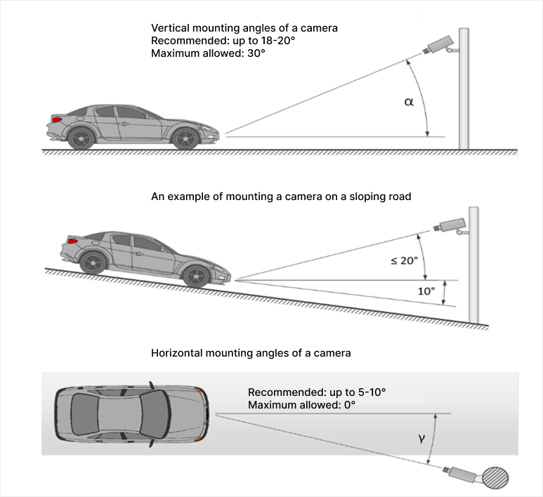 As a result, you’ll receive the relevant camera specifications required for license plate recognition in the specified operating conditions, as well as the geometric placement of the camera (the mounting height and distance from the object of recognition).