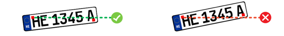 The orientation of a license plate in the frame should obey the “one line” rule, meaning an imaginary horizontal line must intersect the first and last character of the car license plate.