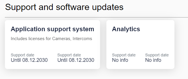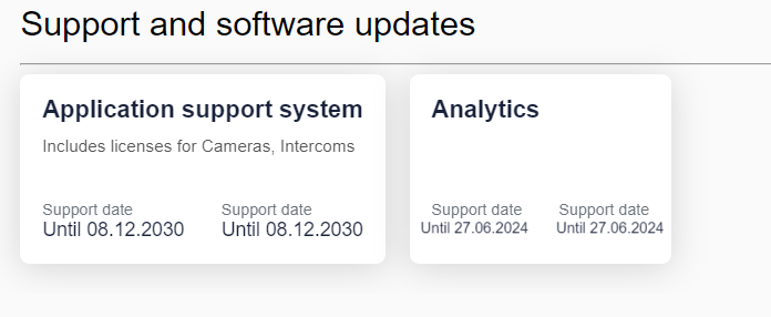 The Support and software updates subsection informs users about technical support expiration and software update options.
