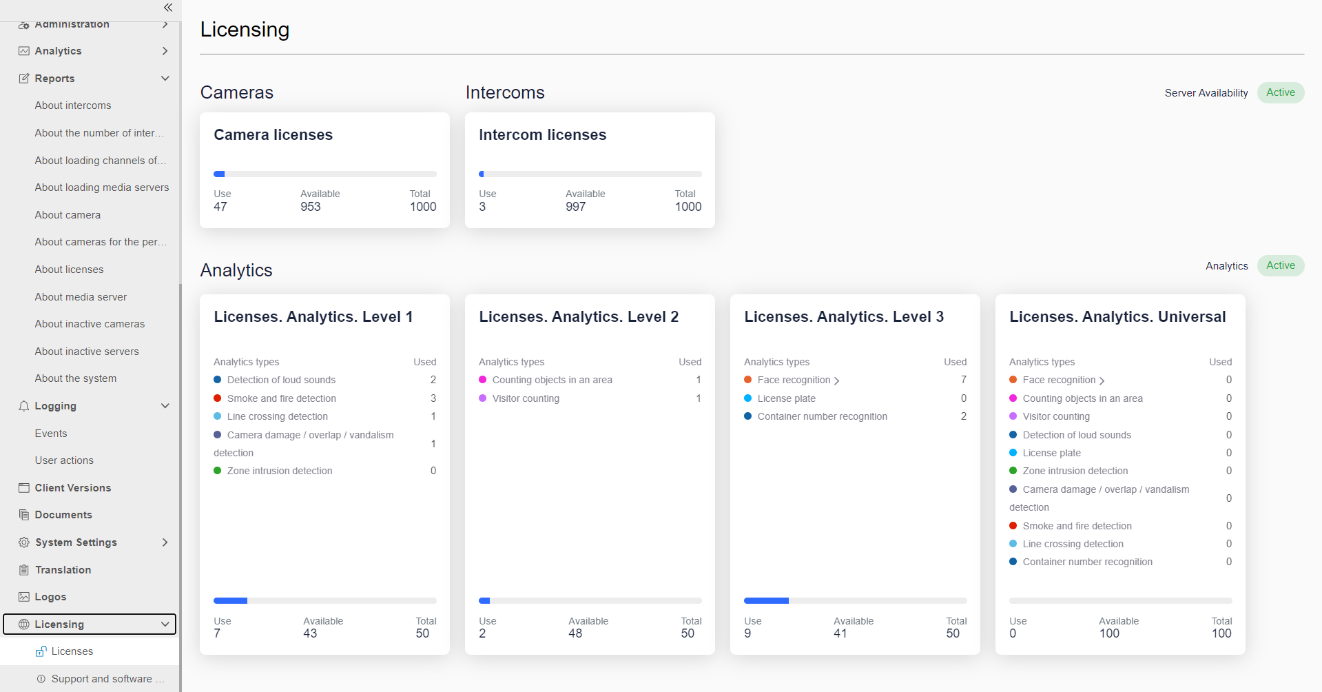 Devices – the number of licenses that are used by the intercom through the Administrator client.