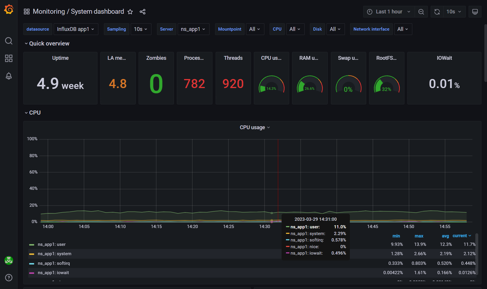 System dashboard. Monitors server metrics (memory, processes, network, disks, etc.).