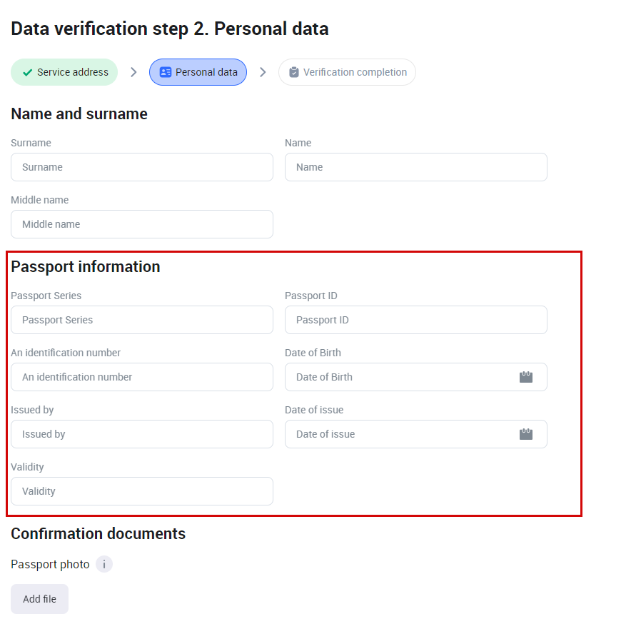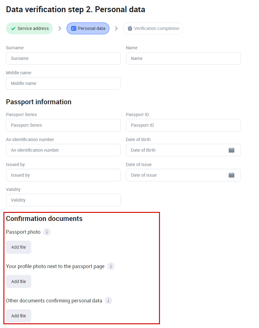 The fields to upload files are available to a user when completing their personal data on step 2 (Personal data) of the data verification process on the User Portal. The purpose of the field is to upload images of a passport or other types of the identification documents.