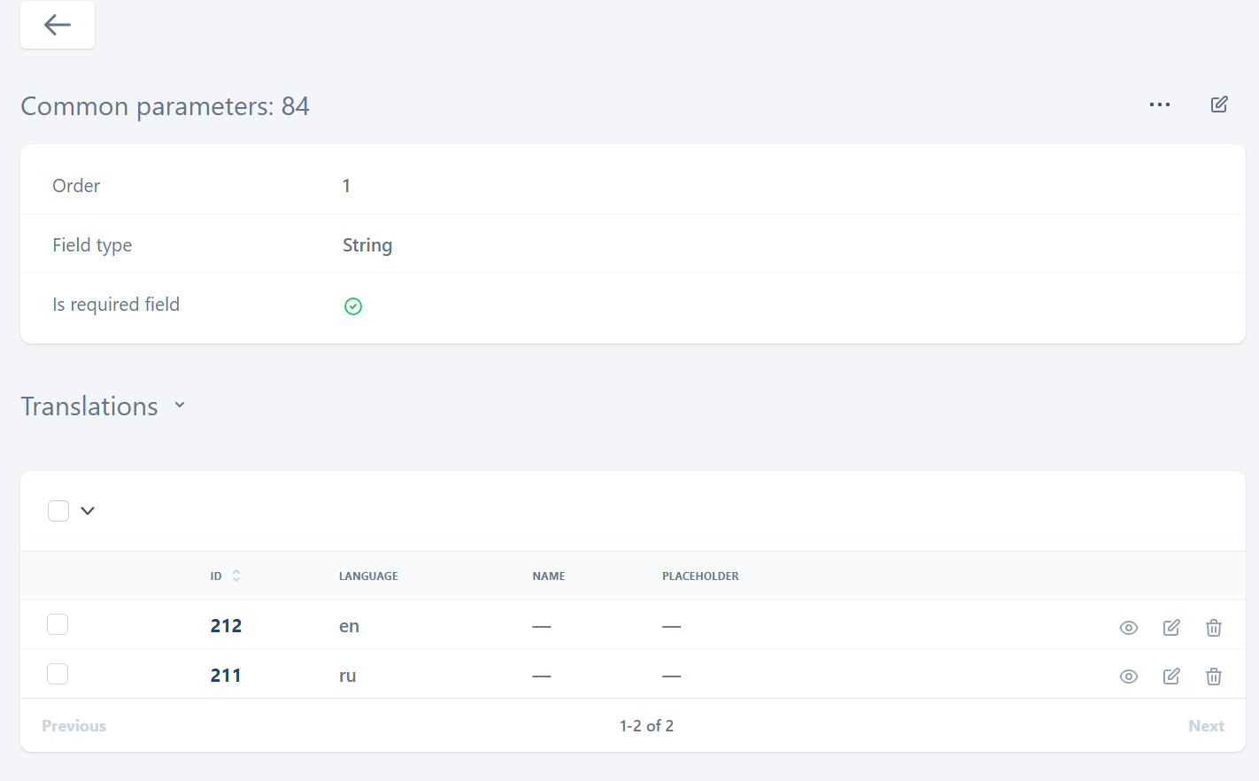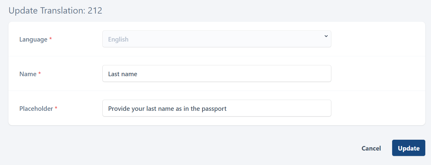 In the Translations section, provide translation for each language that is available on the User Portal. For this, select the Edit icon for a relevant language. This opens the following page, as on the image below: