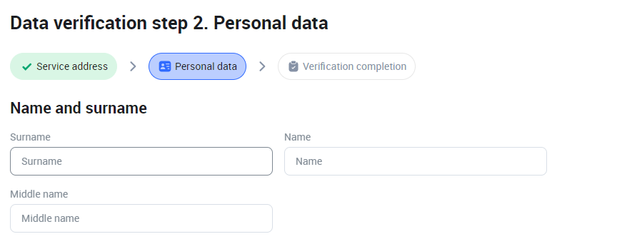 Every element is allocated an order number that mirrors its hierarchical position. Should any element be removed, or its sequence altered, the system will adjust the order numbers to reflect these changes. Below, is the example of the fields that user completes on step 2 (Personal data) on the User Portal.