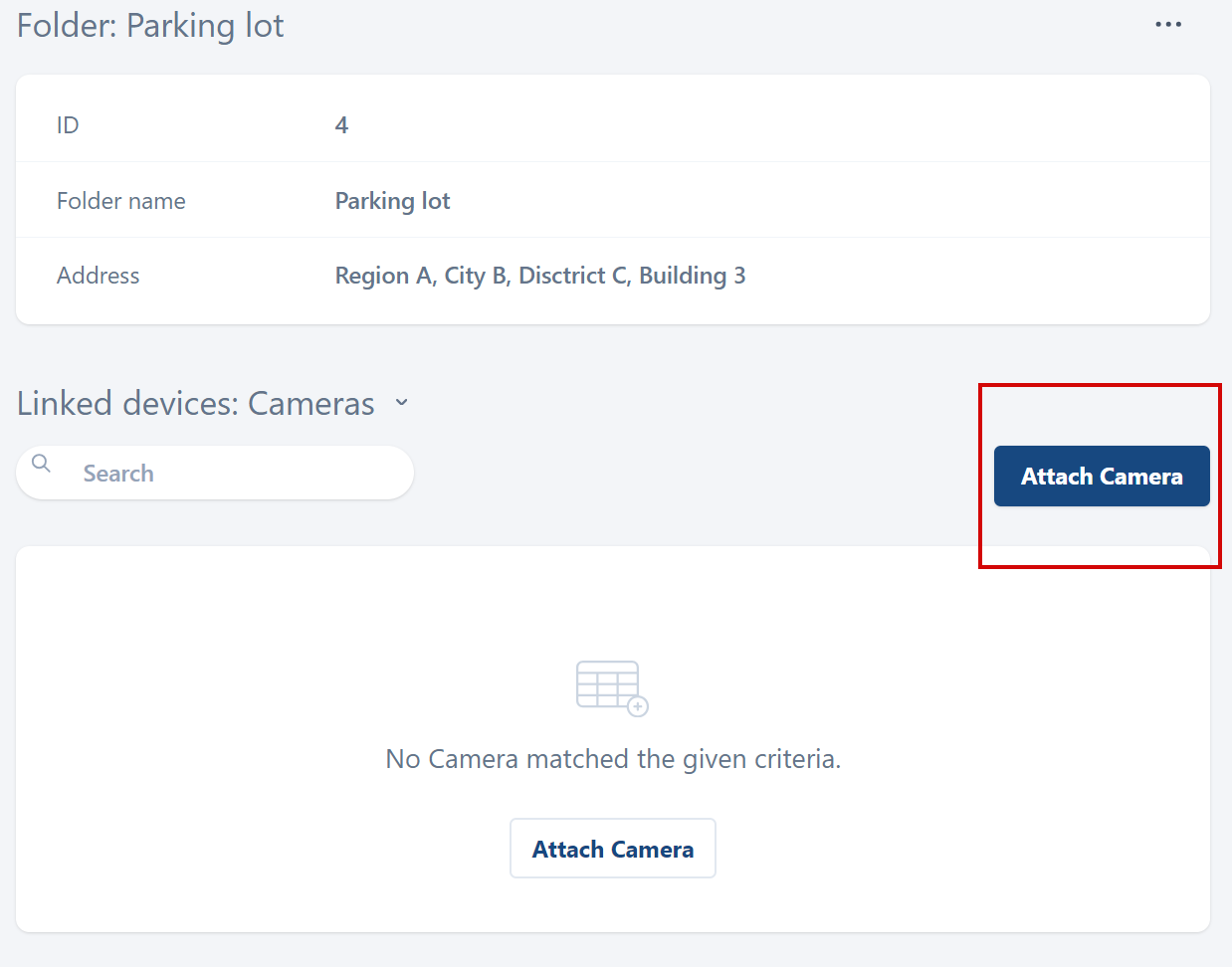 In the relevant folder, select Attach camera in the Linked devices: Cameras section.