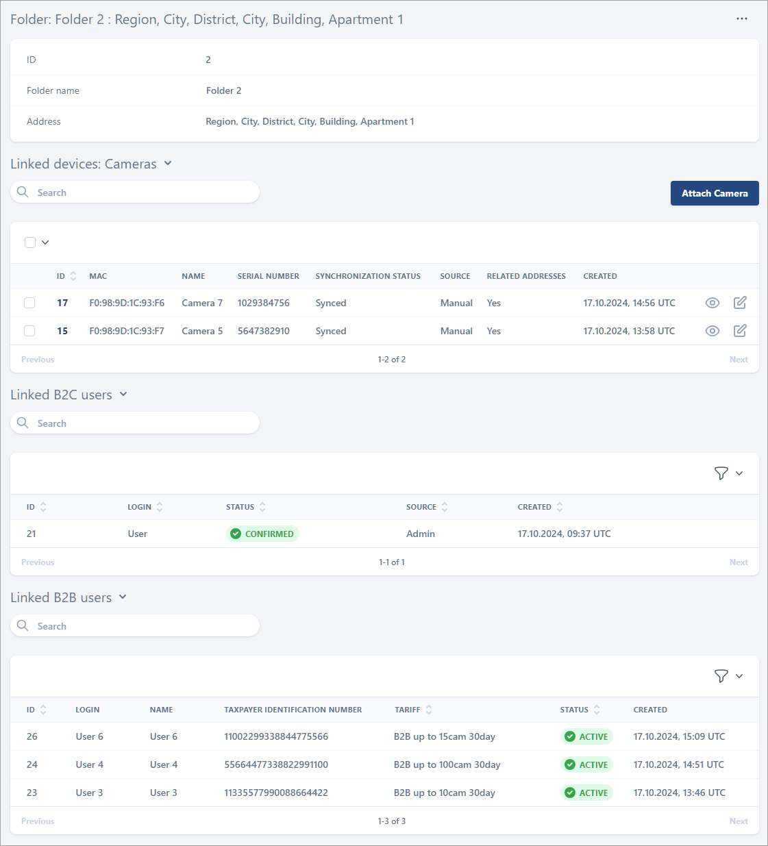 The Linked B2C users section lists the B2C users linked to the current private folder to be able to access cameras. You can only view the list. To link a B2C user with this folder, navigate to a B2C user card.