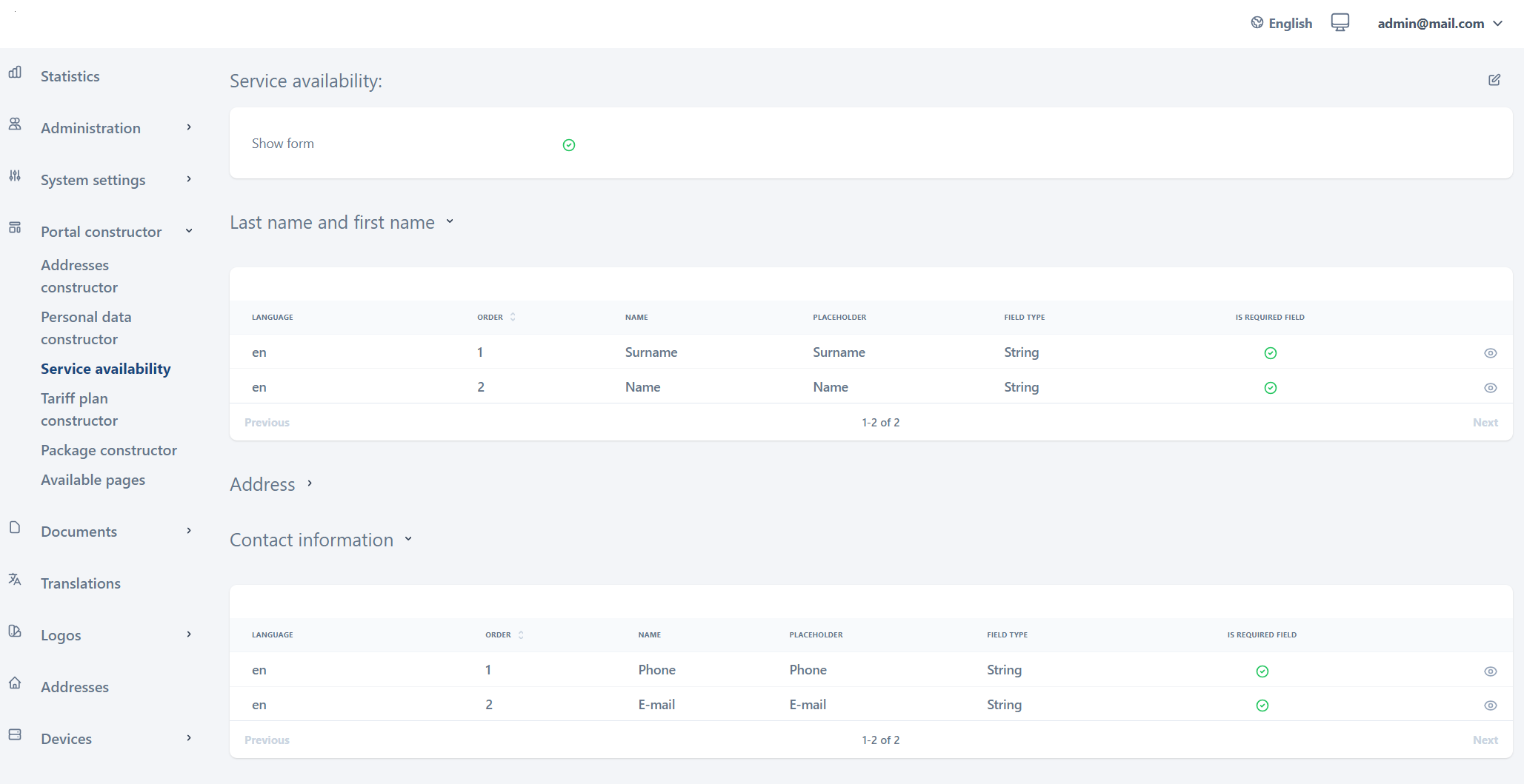 In the Service availability section, the administrator can manage the availability of a special form that users of the User Portal can submit with a request to include the address in the expansion plan of the provider.