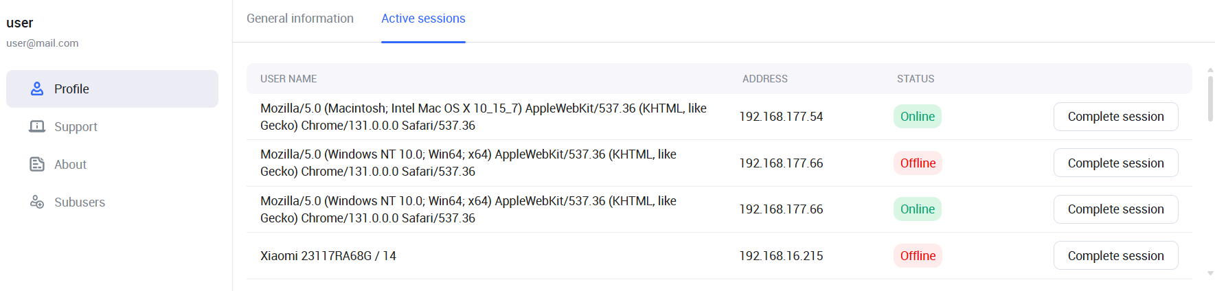 The tab displays a list of active and inactive sessions of the current user and their subusers.