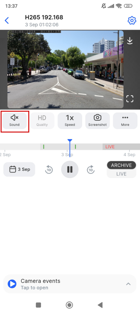 In Archive mode, audio is available when the video playback speed is set to 1x. When another speed is selected, the icon becomes inactive.