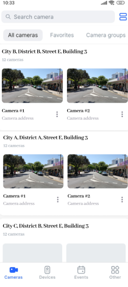 In the Cameras section, the mobile app user can access all the video surveillance cameras available to them. The cameras are grouped according to various criteria on the following tabs: All cameras, Favorites, Camera groups.