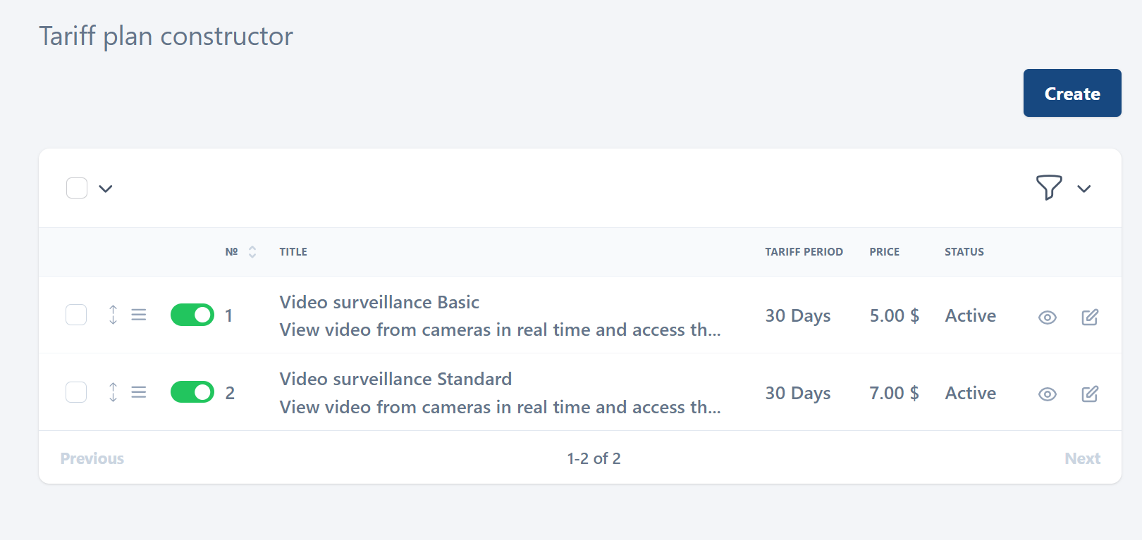 When you navigate to the Tariff plan constructor section, you can view the list of the existing tariff plans.