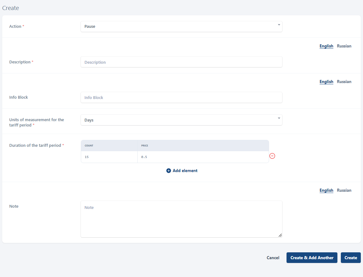 Duration of the tariff period. In the table, specify the pause duration and its price. You can add multiple duration periods. The User Portal user will be able to select one of the provided periods.