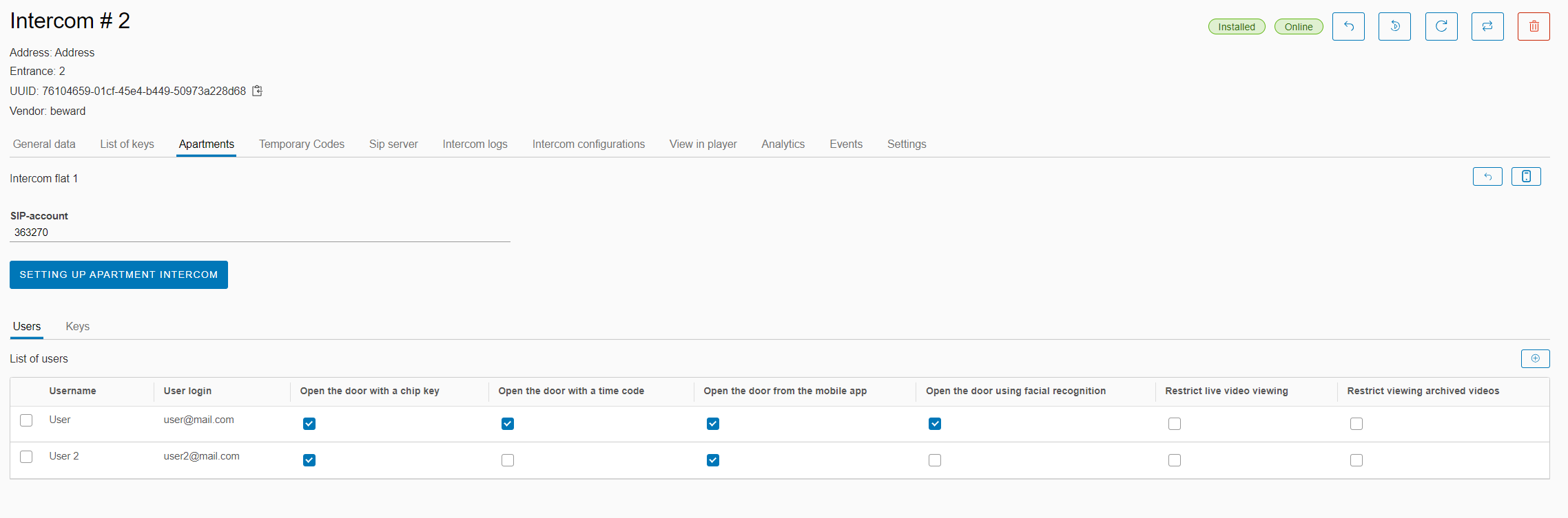 For each user, you can restrict video viewing from the current intercom camera and set restrictions to the door opening options.