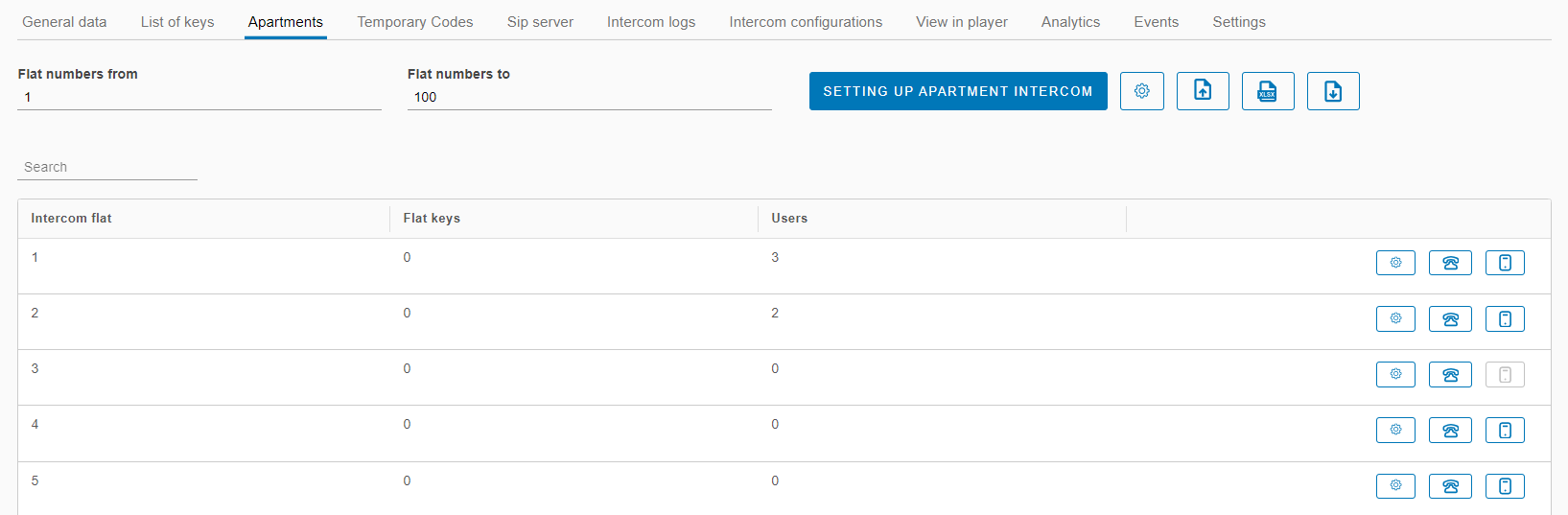 Configure apartments. Here, you can manage general settings for all apartments and individual settings for each apartment. A detailed description of the settings is provided in the Apartment settings section.