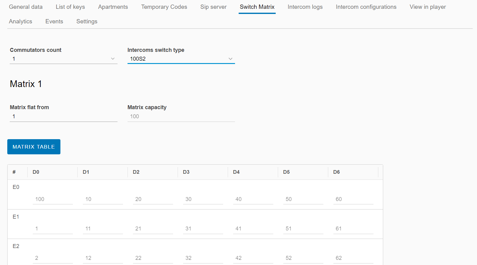 For Beward intercoms, the matrix is filled in automatically and can’t be edited.