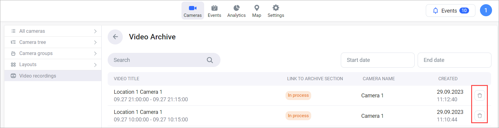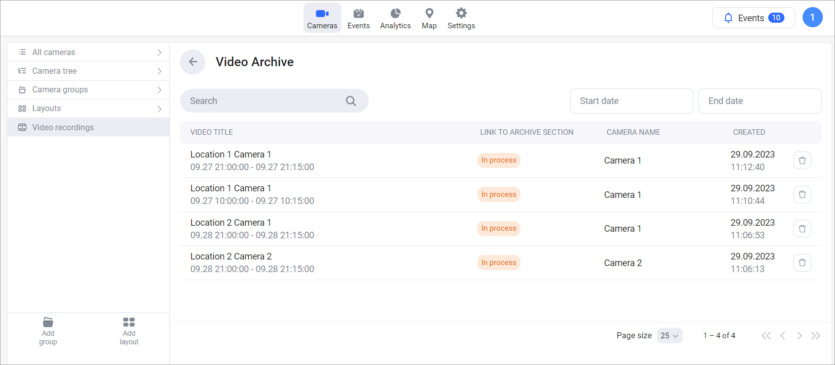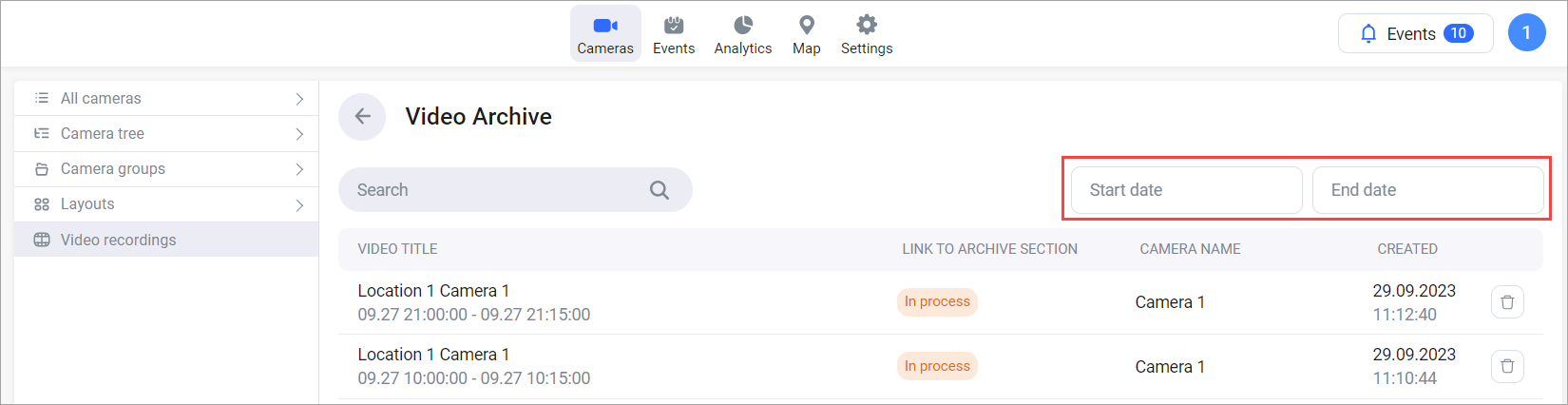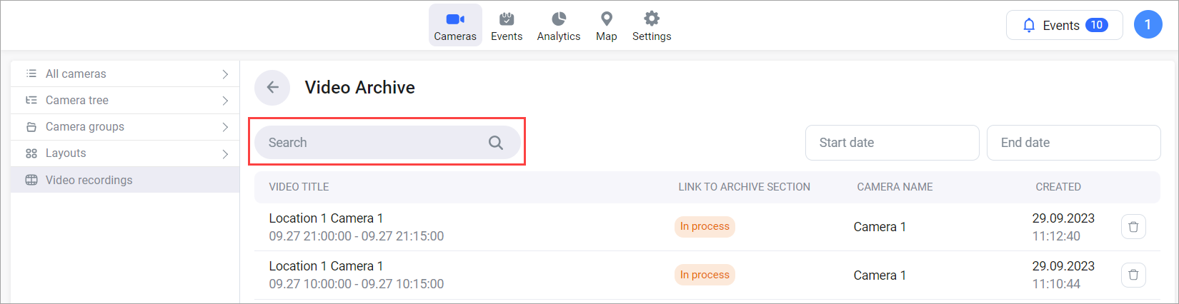 Use the Search field to search by camera name for a relevant downloaded segment.