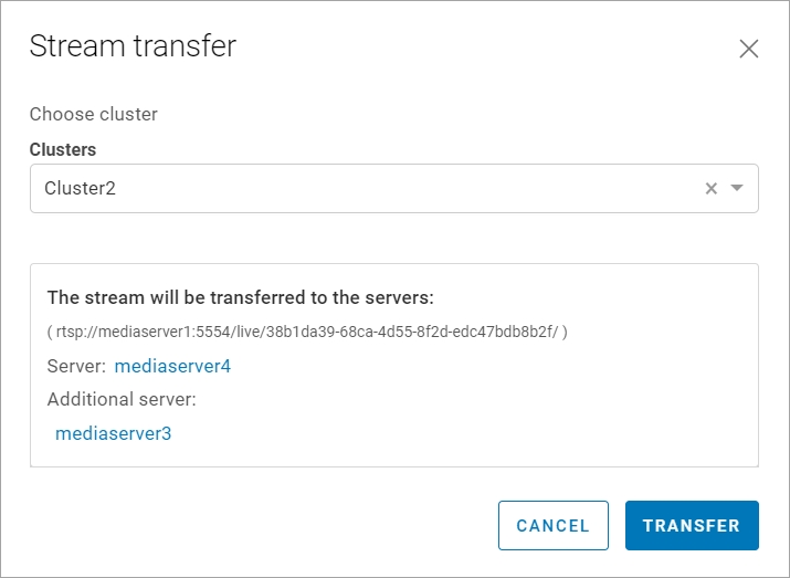 If the stream is not reserved, the system performs a search for the main media server among the non-clustered media servers. When the search is completed, you can select a cluster with two media servers to reserve the stream on an additional media server.