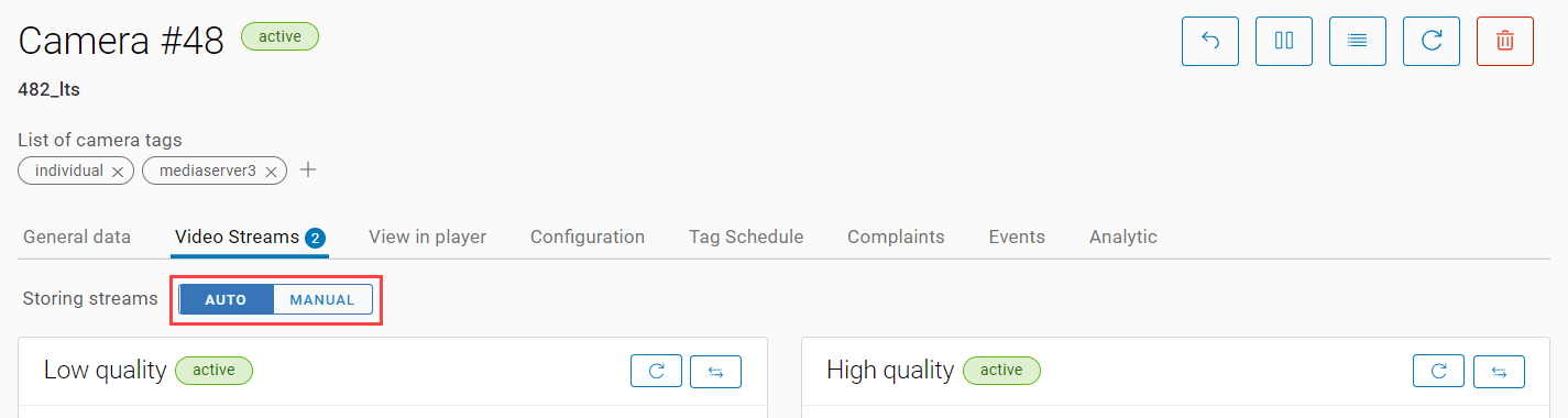 The Storing streams (stream activation) toggle is available for cameras that were added automatically or added automatically, including the manual stream activation.
