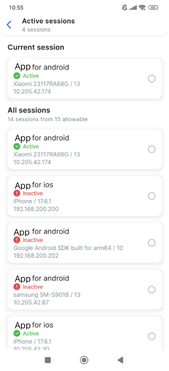 If you close a current active session on your mobile app and confirm it, you’ll exit the account and will be redirected to the authorization tab.