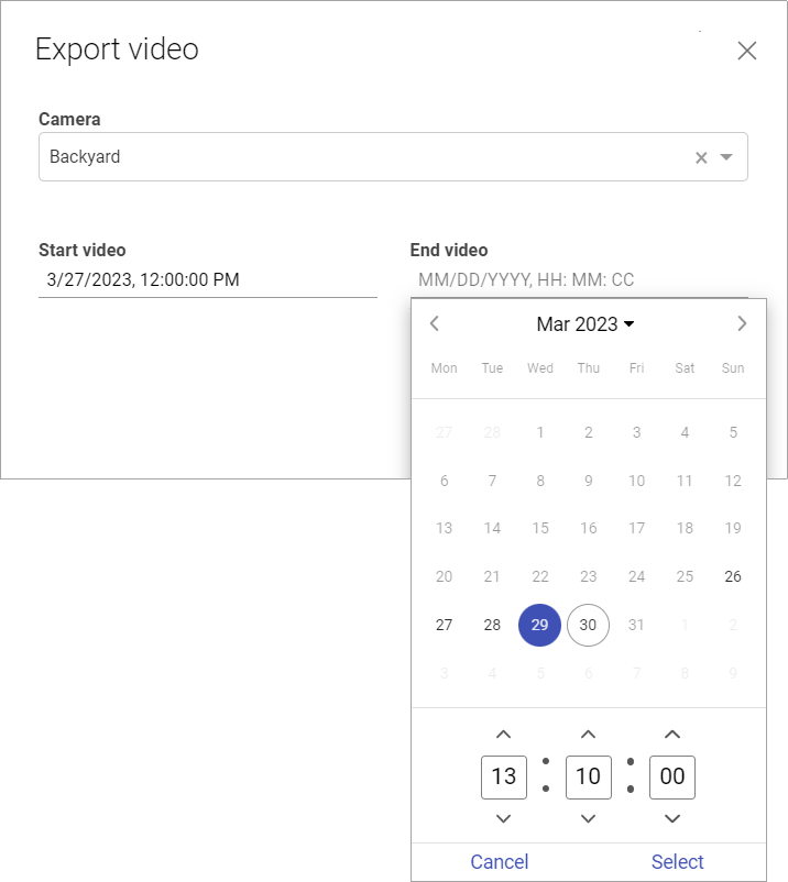 You can also select a specific date and time to view the recording. Select the Calendar button, set the date and time, and Select. You can select only the dates where archive is available. The other dates are grayed out.