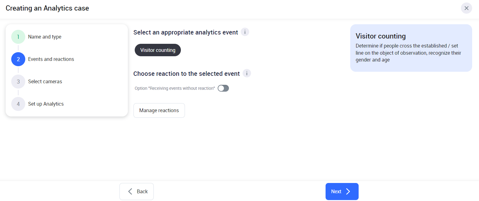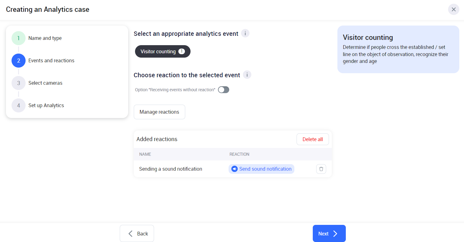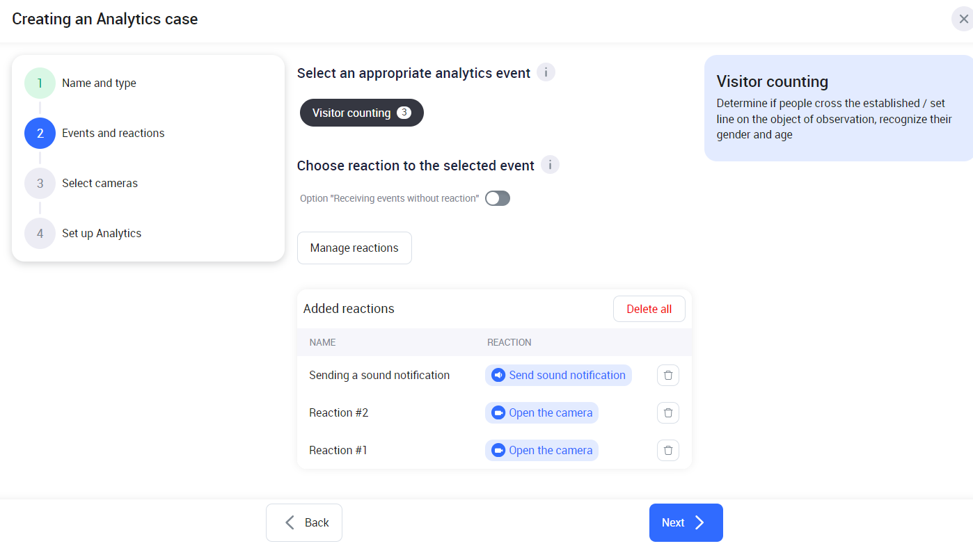 Under Camera reactions, all the added reaction on step 2 to the current analytics case will be enabled by default. Edit the settings if required: