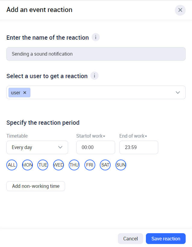 Schedule the reaction period (mandatory). If you select the specific days, the default time is from 00:00 till 23:59. The time can be edited.