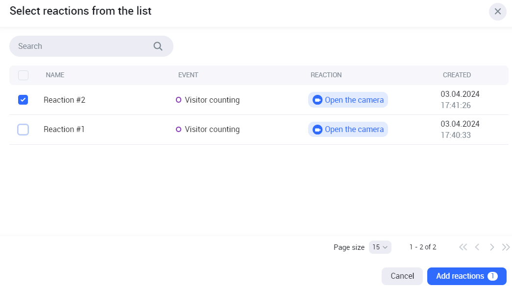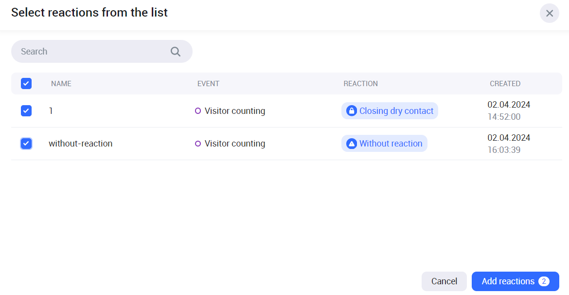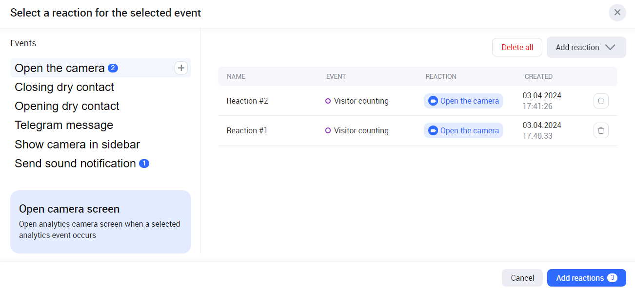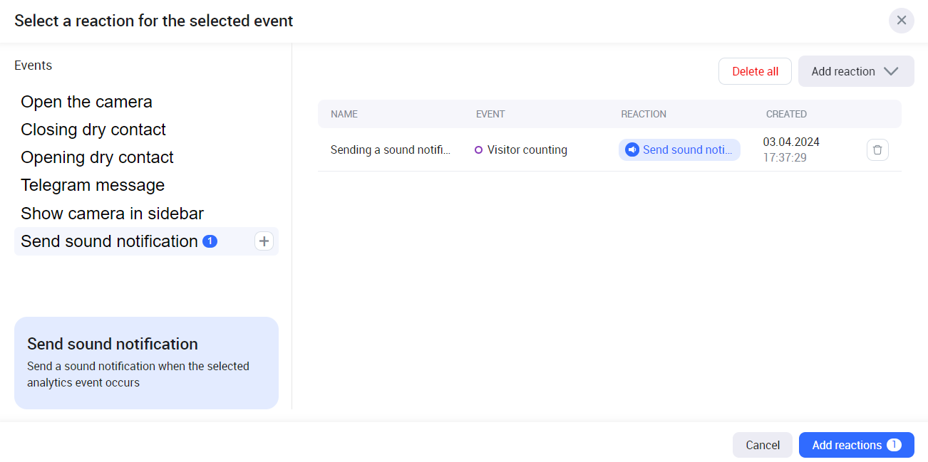 As a result, the added reaction is displayed in the list of reactions of the selected reaction type. To further use this reaction, when setting up cameras, select Add reactions.