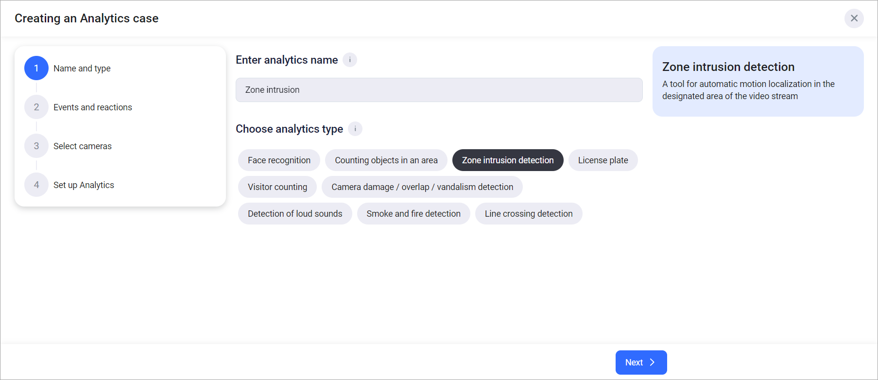 The Zone intrusion detection analytics type is engineered to detect motion within the designated zone that is configured during creation of an analytics case.