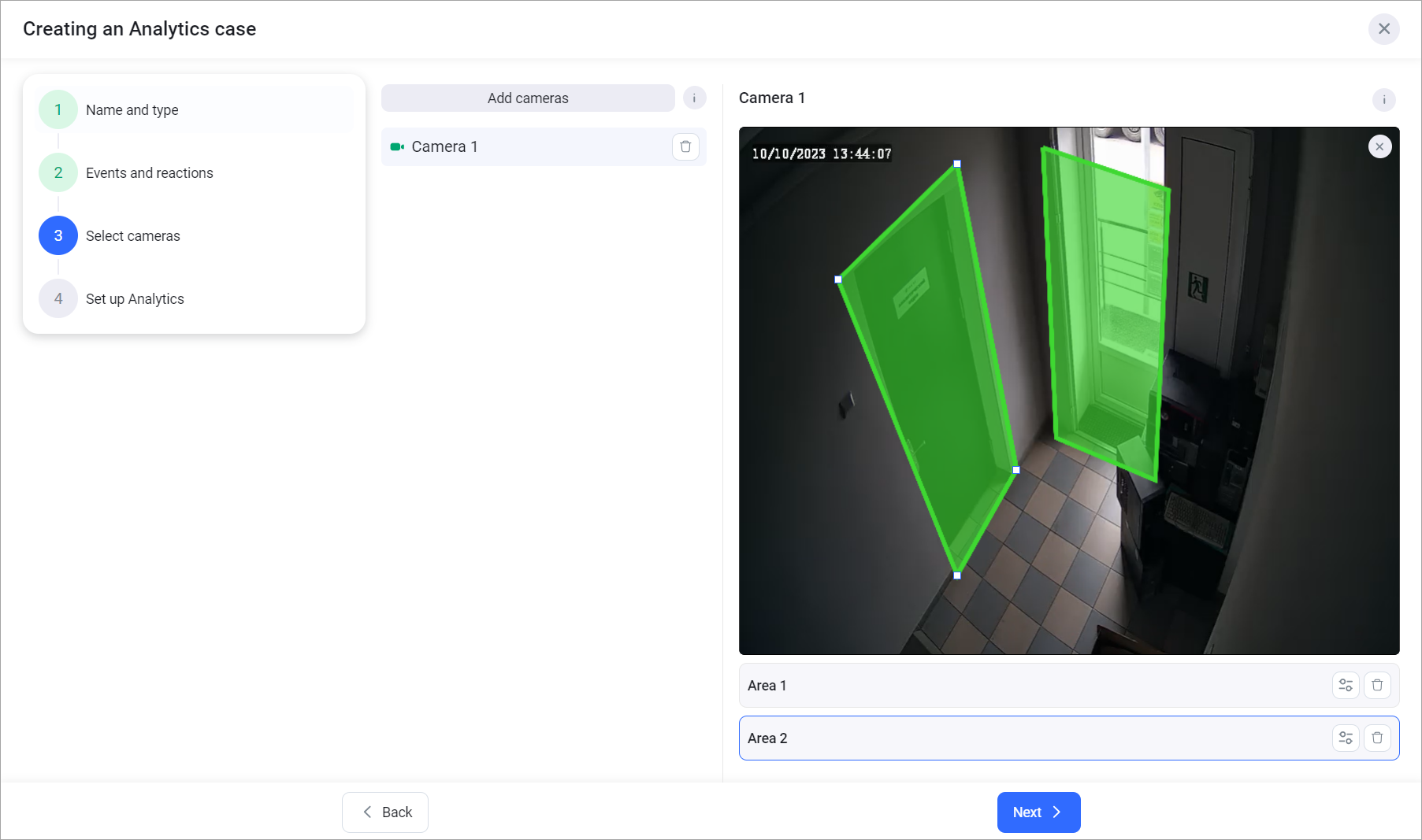 Select the camera name to open it. On the opened camera image, left-click to draw the borders of the area. The borders of the areas should not intersect. Connect the last and first points to create the detection area. The area will be highlighted green when ready.