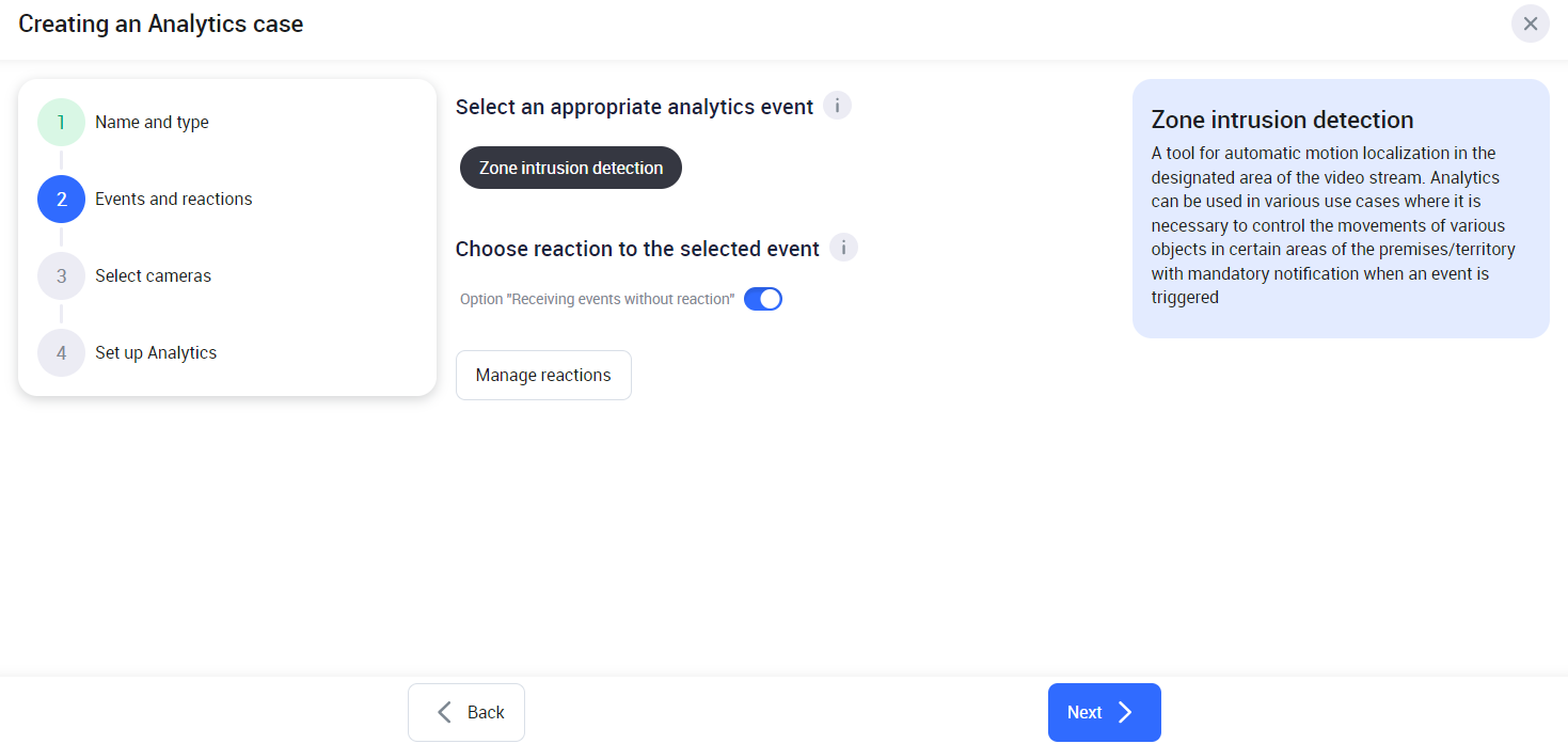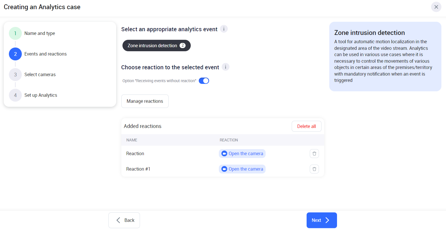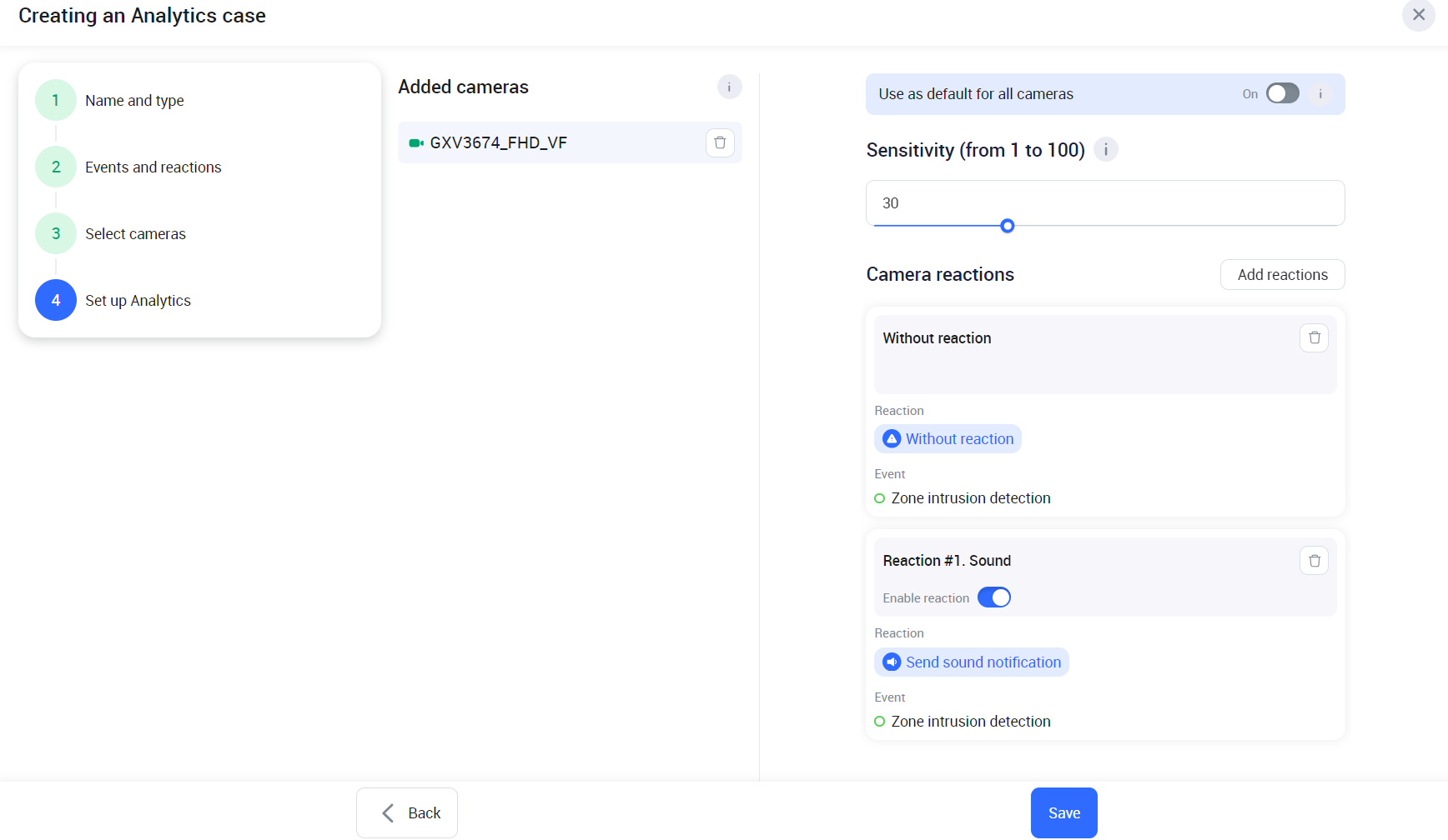 Under Camera reactions, all the added reaction on step 2 to the current analytics case will be enabled by default. Edit the settings if required: