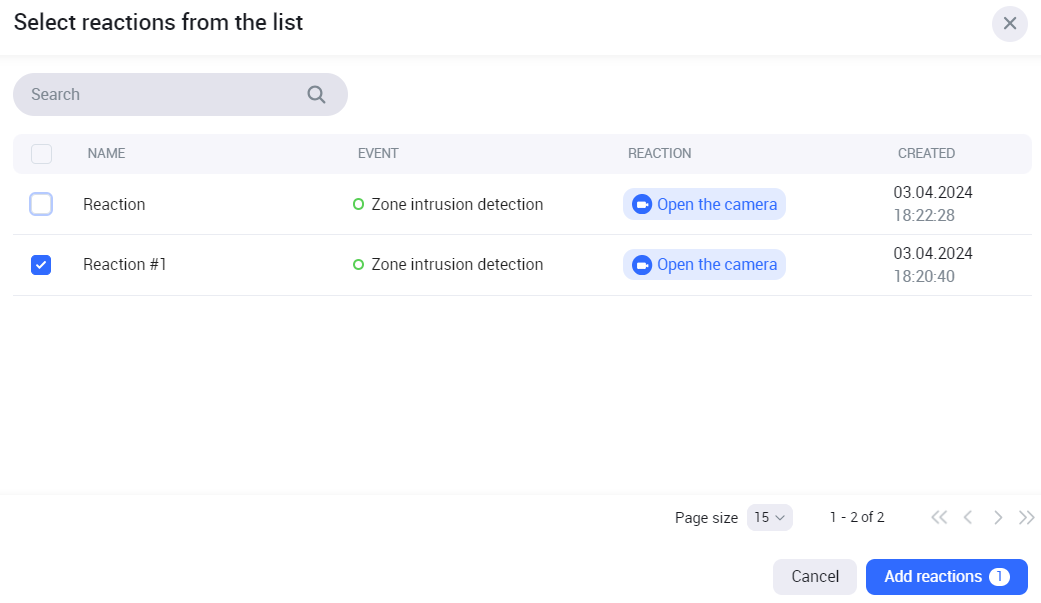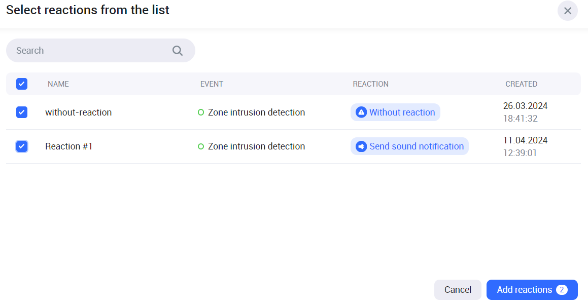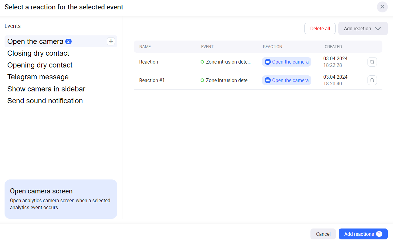As a result, the added reaction is displayed in the list of reactions of the selected reaction type. To further use this reaction, when setting up cameras, select Add reactions.