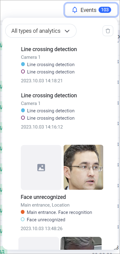 Selecting the Events button, opens a sidebar. The panel displays analytics events for which the Show camera in sidebar reaction was set. To close the panel, select the Events button again.
